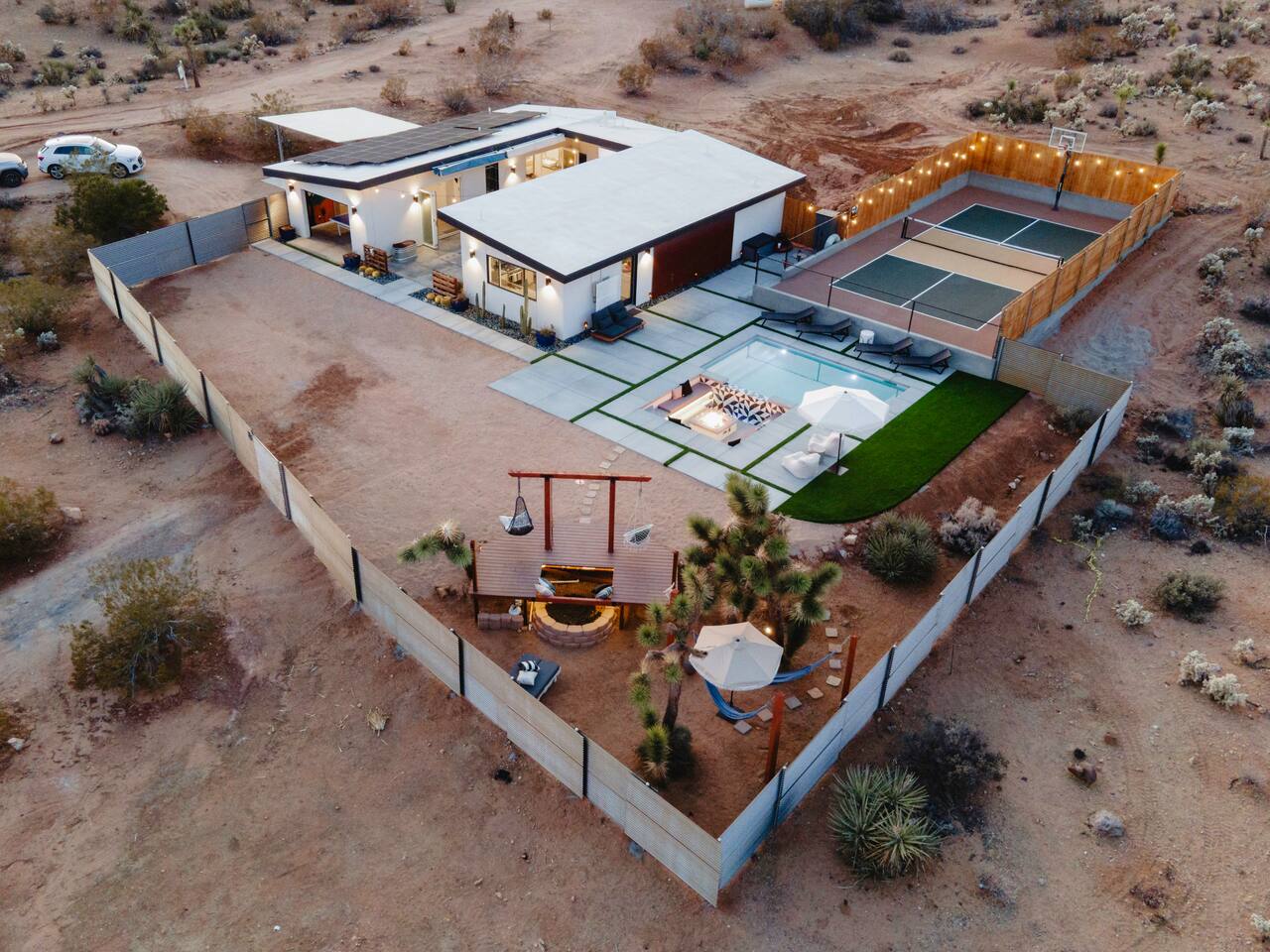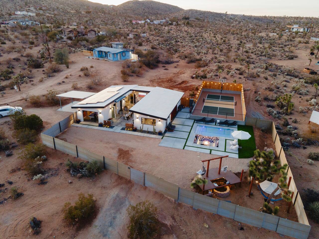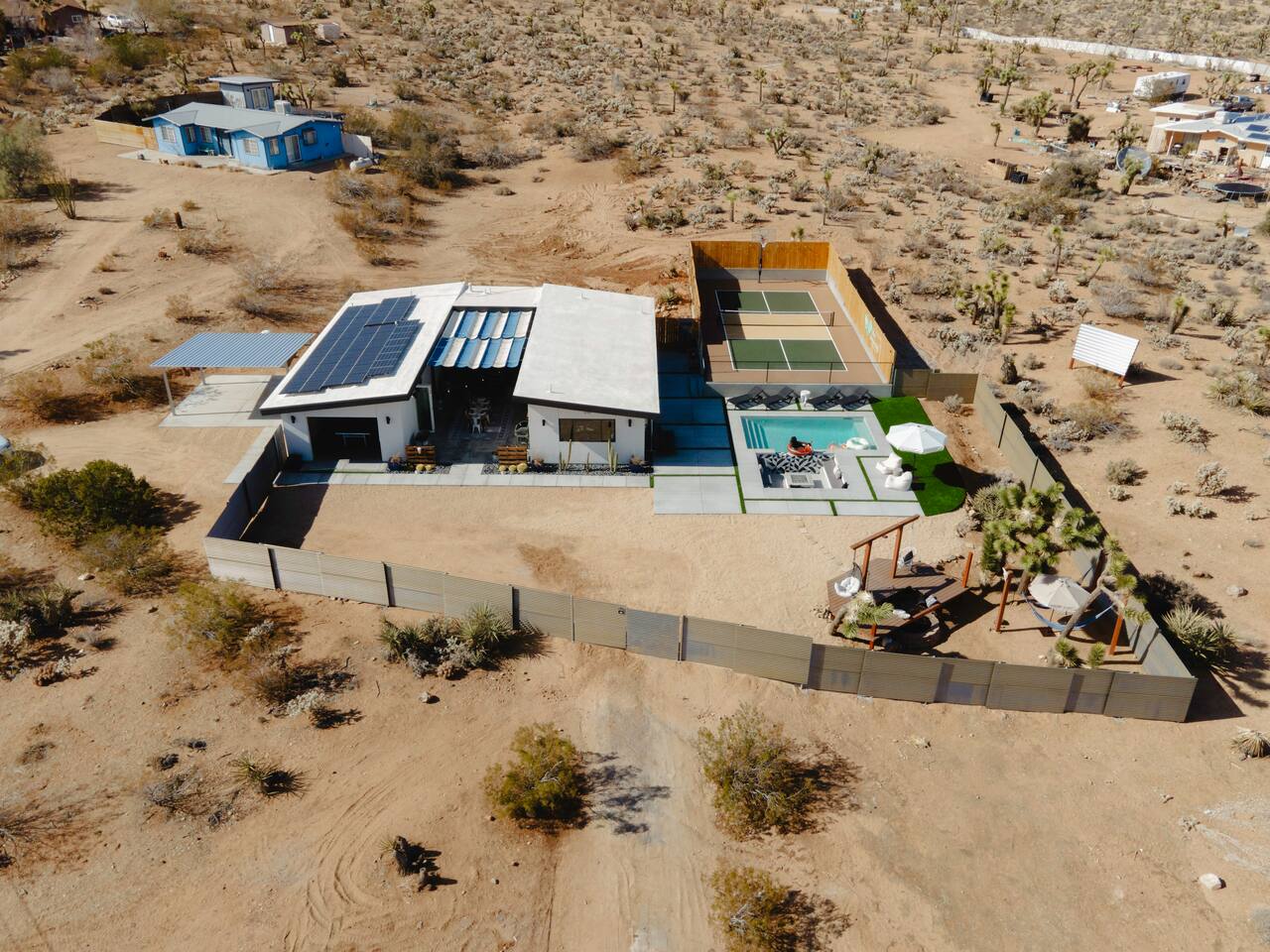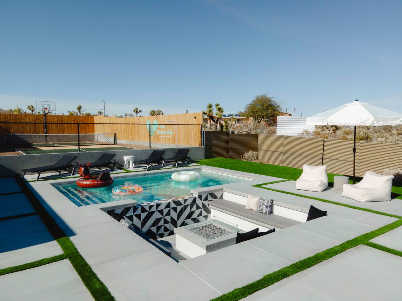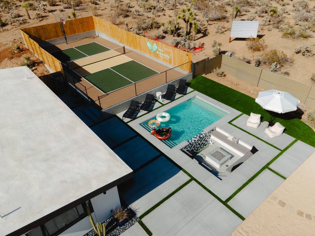 The Ventana Cove Pickleball Retreat by The Ventana Collection has been completely transformed and is back on the market March 2025. The Heated Saltwater Pool with custom waterfall into the sunken fire pit is a feature you won't find anywhere else. Relax on the pool loungers, bean bag chairs or included inflatable toys. The pooI can be heated all year round. Please contact for pool heating fees (varies by temp and season). The Pickleball Court and pro style Basketball Hoop offer a mountain view backdrop and fully fenced in play area so you can spend more time dinking and dunking than fetching. The living space features an open plan design with a plush low line sofa and a bright wingback chair that sit opposite the wall mounted 55" 4K TV with access to Netflix, Apple TV+ and Amazon Prime Video to keep everyone entertained. For additional guests, the couch has a full size sofa bed with 4" memory foam mattress. Slide open the bifold window to create an indoor-outdoor bar where you can serve up breakfast smoothies using the ninja blender or brew up a pot of coffee with your choice of a coffee maker or the French press using local aromatic Joshua Tree Coffee Company and tea. Create your next culinary masterpiece within the high-end gourmet kitchen that comes fully equipped with everything you could need and offers stunning views of the mountains while you cook. There is an oversize French door fridge with a filtered water and ice dispenser, a free-standing oven and stovetop, a microwave and a dishwasher to handle all the cleaning up. Dine inside at the modern dining table set for four, sit at the bar or eat alfresco style out on the patio with a rustic dining table under the retractable canopy to keep you out of the sun. There are three spacious bedrooms within the cove that are all separate from each other and feature huge “La Cantina” door walls that open out into the patio creating a seamless flow from one room to the other. Each of the bedrooms have their own private ensuite bathroom with luxurious rain fall showers and vanities stocked with all the essentials. The two master suites are filled with large memory foam king beds topped with hotel quality linen and bedding while the 3rd bedroom doubles as a studio where guests can roll out the ping pong table or open up the massive glass garage door to create the perfect space for a workout or to practice yoga. Or relive your youth on the Simpsons and Street Fighter arcade games. Then at night, drop down the comfortable memory foam queen size murphy bed for a restful night’s sleep. There are two desks. One is a fully enclosed office space for when you need complete isolation, the other is in the second bedroom. Very private and separated from the main living area. Wander over to the elevated stargazing deck and take an outdoor shower under the stars. Lounge in the stargazing net, then take a nap or read a book on of the relaxing hammocks under the shade of the Joshua trees. When night falls, light up the fire pit at the push of a button and enjoy the company of friends before retiring to the 6-person hot tub where you can Airplay your favorite songs through the multi-zone Sonos audio system. Watch a movie or put on the game with a huge new 85" TV above the hot tub or just lay back with a drink in hand and gaze up at the crystal clear night sky glittered with millions of stars. Electric Vehicle? There's a L2 40A charger in the carport for your convenience. We're pet friendly! The property is fenced in with special attention taken to remove all the *spikey things* that can get into paws.