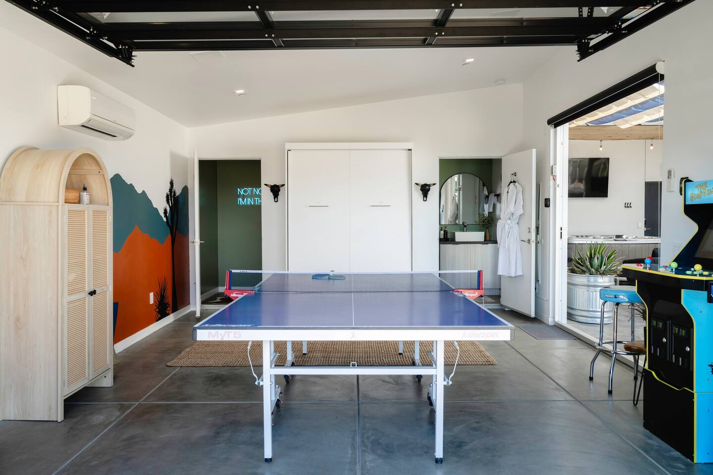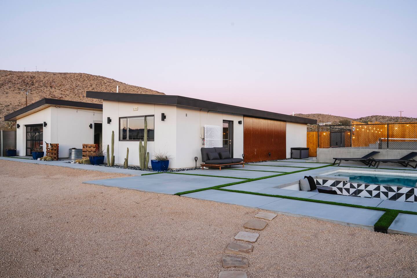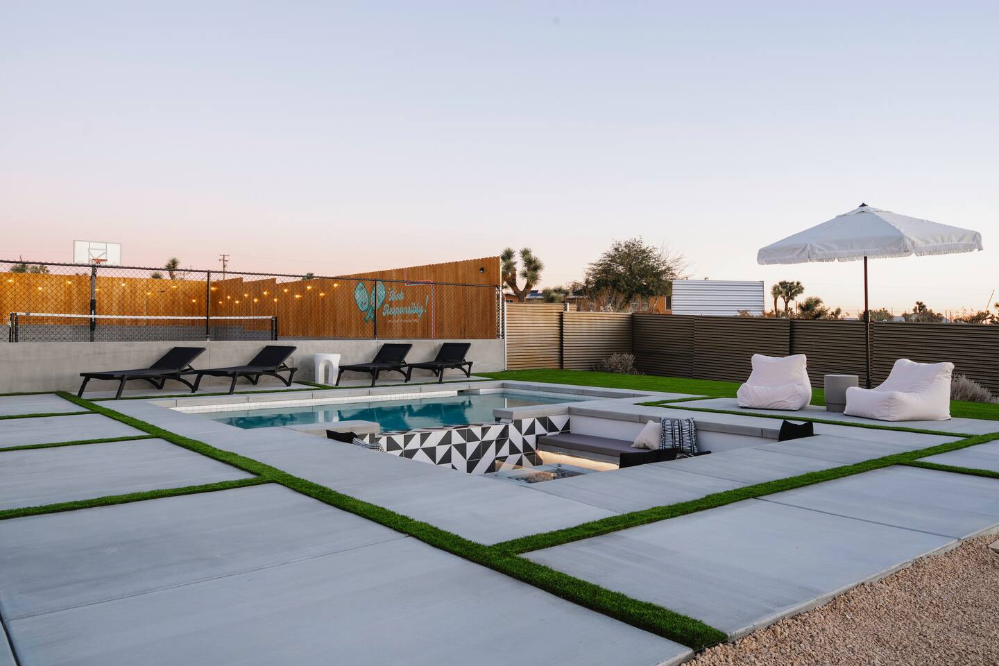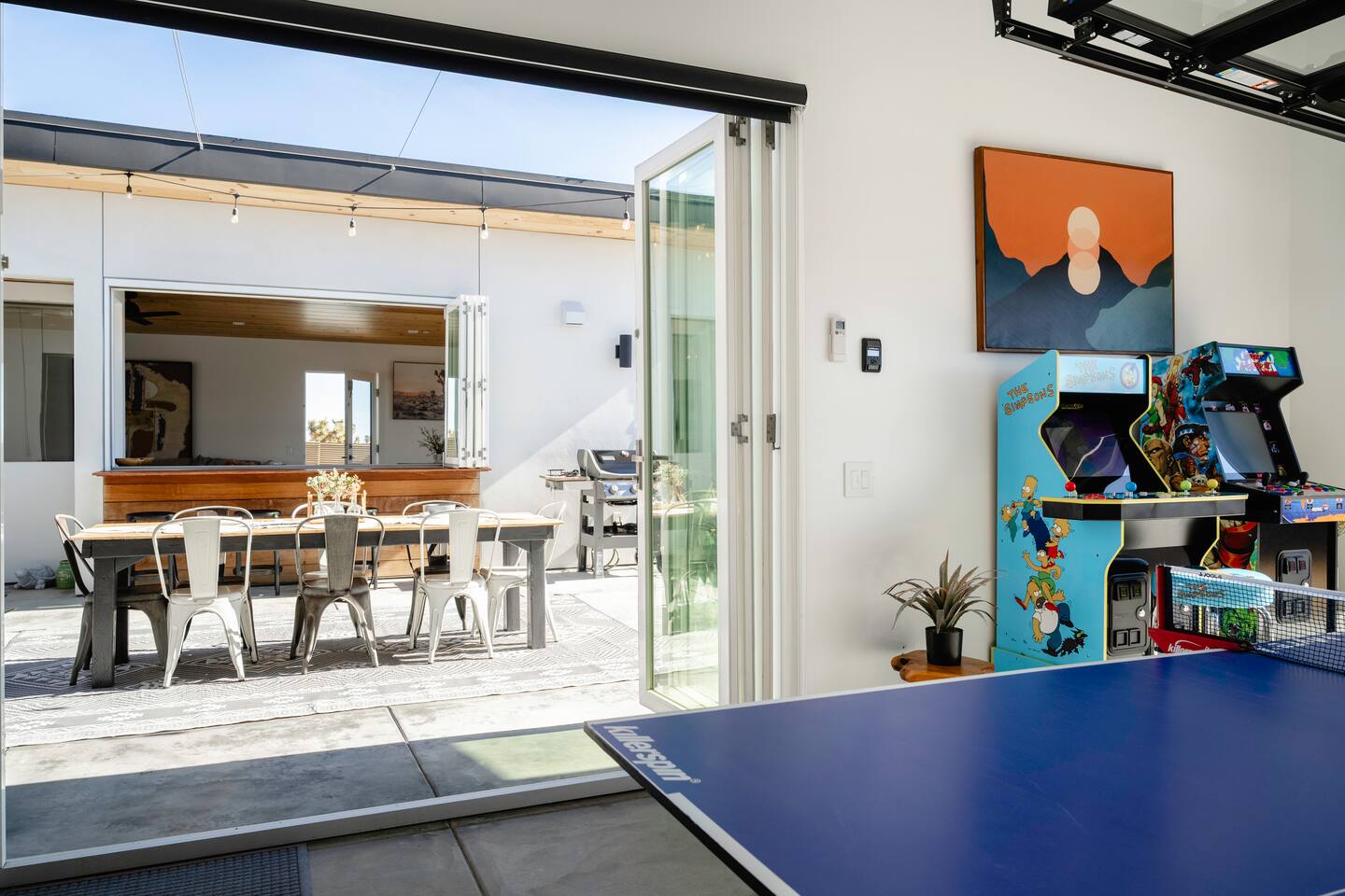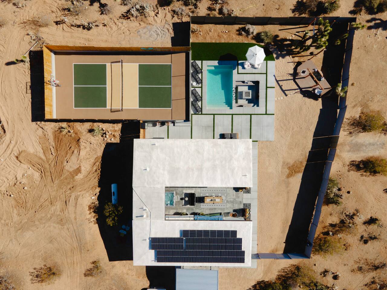 The Ventana Cove Pickleball Retreat by The Ventana Collection has been completely transformed and is back on the market March 2025. The Heated Saltwater Pool with custom waterfall into the sunken fire pit is a feature you won't find anywhere else. Relax on the pool loungers, bean bag chairs or included inflatable toys. The pooI can be heated all year round. Please contact for pool heating fees (varies by temp and season). The Pickleball Court and pro style Basketball Hoop offer a mountain view backdrop and fully fenced in play area so you can spend more time dinking and dunking than fetching. The living space features an open plan design with a plush low line sofa and a bright wingback chair that sit opposite the wall mounted 55" 4K TV with access to Netflix, Apple TV+ and Amazon Prime Video to keep everyone entertained. For additional guests, the couch has a full size sofa bed with 4" memory foam mattress. Slide open the bifold window to create an indoor-outdoor bar where you can serve up breakfast smoothies using the ninja blender or brew up a pot of coffee with your choice of a coffee maker or the French press using local aromatic Joshua Tree Coffee Company and tea. Create your next culinary masterpiece within the high-end gourmet kitchen that comes fully equipped with everything you could need and offers stunning views of the mountains while you cook. There is an oversize French door fridge with a filtered water and ice dispenser, a free-standing oven and stovetop, a microwave and a dishwasher to handle all the cleaning up. Dine inside at the modern dining table set for four, sit at the bar or eat alfresco style out on the patio with a rustic dining table under the retractable canopy to keep you out of the sun. There are three spacious bedrooms within the cove that are all separate from each other and feature huge “La Cantina” door walls that open out into the patio creating a seamless flow from one room to the other. Each of the bedrooms have their own private ensuite bathroom with luxurious rain fall showers and vanities stocked with all the essentials. The two master suites are filled with large memory foam king beds topped with hotel quality linen and bedding while the 3rd bedroom doubles as a studio where guests can roll out the ping pong table or open up the massive glass garage door to create the perfect space for a workout or to practice yoga. Or relive your youth on the Simpsons and Street Fighter arcade games. Then at night, drop down the comfortable memory foam queen size murphy bed for a restful night’s sleep. There are two desks. One is a fully enclosed office space for when you need complete isolation, the other is in the second bedroom. Very private and separated from the main living area. Wander over to the elevated stargazing deck and take an outdoor shower under the stars. Lounge in the stargazing net, then take a nap or read a book on of the relaxing hammocks under the shade of the Joshua trees. When night falls, light up the fire pit at the push of a button and enjoy the company of friends before retiring to the 6-person hot tub where you can Airplay your favorite songs through the multi-zone Sonos audio system. Watch a movie or put on the game with a huge new 85" TV above the hot tub or just lay back with a drink in hand and gaze up at the crystal clear night sky glittered with millions of stars. Electric Vehicle? There's a L2 40A charger in the carport for your convenience. We're pet friendly! The property is fenced in with special attention taken to remove all the *spikey things* that can get into paws.