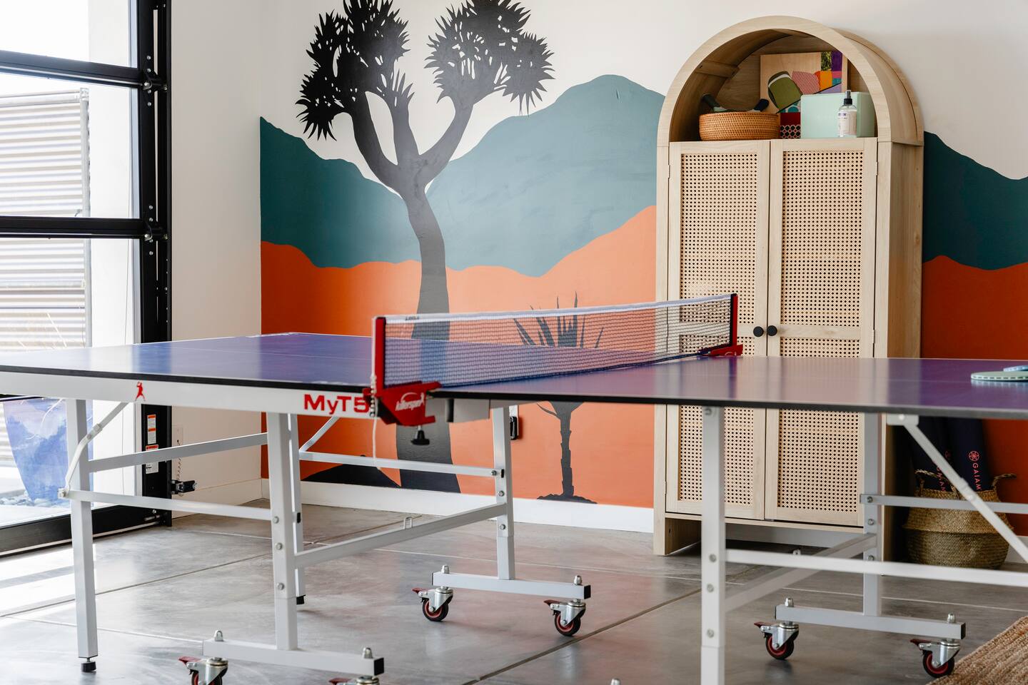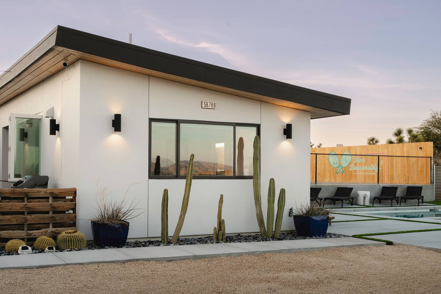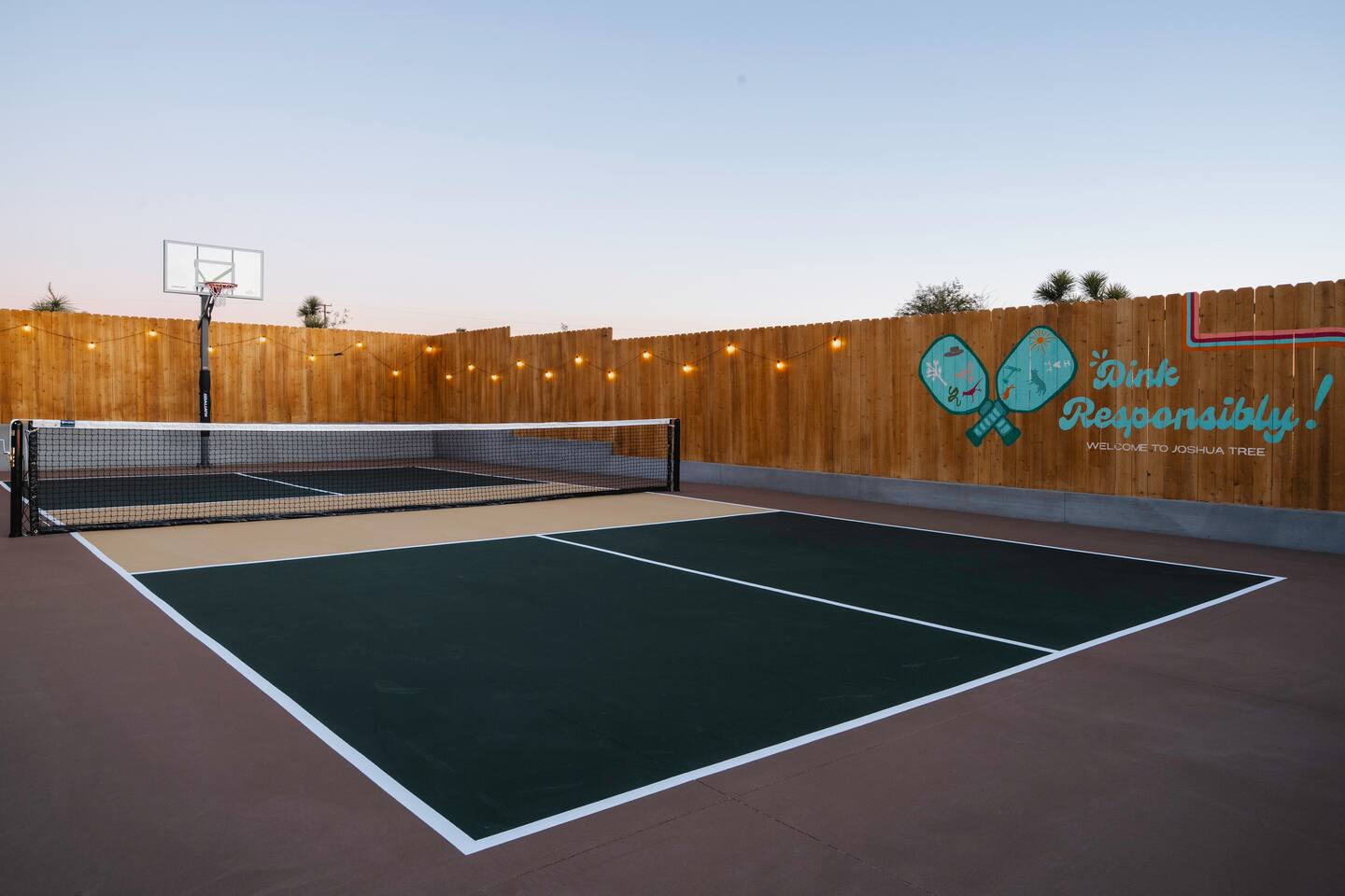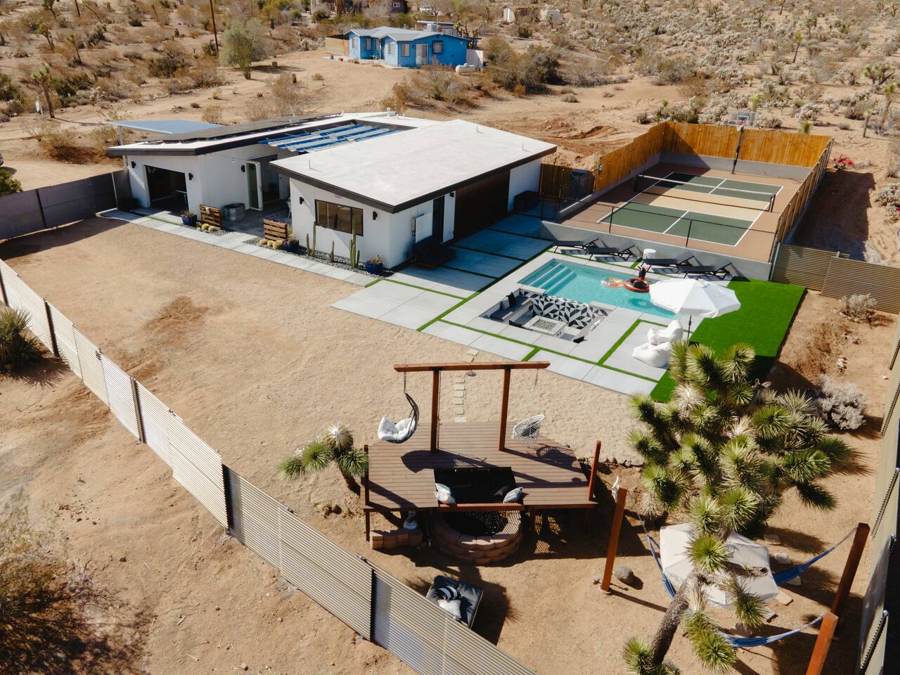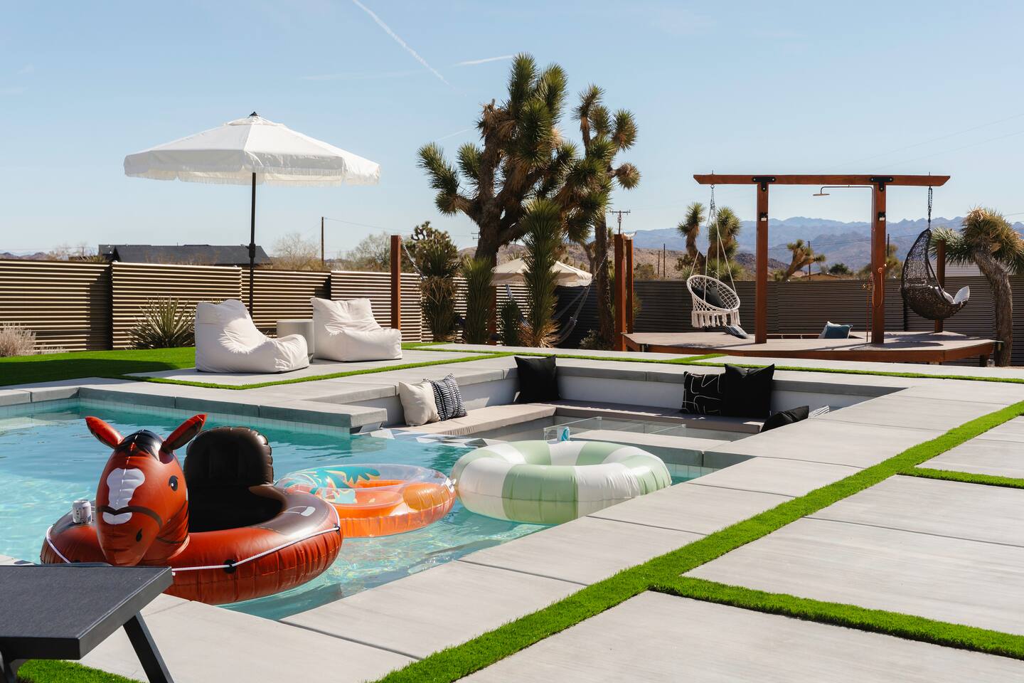 The Ventana Cove Pickleball Retreat by The Ventana Collection has been completely transformed and is back on the market March 2025. The Heated Saltwater Pool with custom waterfall into the sunken fire pit is a feature you won't find anywhere else. Relax on the pool loungers, bean bag chairs or included inflatable toys. The pooI can be heated all year round. Please contact for pool heating fees (varies by temp and season). The Pickleball Court and pro style Basketball Hoop offer a mountain view backdrop and fully fenced in play area so you can spend more time dinking and dunking than fetching. The living space features an open plan design with a plush low line sofa and a bright wingback chair that sit opposite the wall mounted 55" 4K TV with access to Netflix, Apple TV+ and Amazon Prime Video to keep everyone entertained. For additional guests, the couch has a full size sofa bed with 4" memory foam mattress. Slide open the bifold window to create an indoor-outdoor bar where you can serve up breakfast smoothies using the ninja blender or brew up a pot of coffee with your choice of a coffee maker or the French press using local aromatic Joshua Tree Coffee Company and tea. Create your next culinary masterpiece within the high-end gourmet kitchen that comes fully equipped with everything you could need and offers stunning views of the mountains while you cook. There is an oversize French door fridge with a filtered water and ice dispenser, a free-standing oven and stovetop, a microwave and a dishwasher to handle all the cleaning up. Dine inside at the modern dining table set for four, sit at the bar or eat alfresco style out on the patio with a rustic dining table under the retractable canopy to keep you out of the sun. There are three spacious bedrooms within the cove that are all separate from each other and feature huge “La Cantina” door walls that open out into the patio creating a seamless flow from one room to the other. Each of the bedrooms have their own private ensuite bathroom with luxurious rain fall showers and vanities stocked with all the essentials. The two master suites are filled with large memory foam king beds topped with hotel quality linen and bedding while the 3rd bedroom doubles as a studio where guests can roll out the ping pong table or open up the massive glass garage door to create the perfect space for a workout or to practice yoga. Or relive your youth on the Simpsons and Street Fighter arcade games. Then at night, drop down the comfortable memory foam queen size murphy bed for a restful night’s sleep. There are two desks. One is a fully enclosed office space for when you need complete isolation, the other is in the second bedroom. Very private and separated from the main living area. Wander over to the elevated stargazing deck and take an outdoor shower under the stars. Lounge in the stargazing net, then take a nap or read a book on of the relaxing hammocks under the shade of the Joshua trees. When night falls, light up the fire pit at the push of a button and enjoy the company of friends before retiring to the 6-person hot tub where you can Airplay your favorite songs through the multi-zone Sonos audio system. Watch a movie or put on the game with a huge new 85" TV above the hot tub or just lay back with a drink in hand and gaze up at the crystal clear night sky glittered with millions of stars. Electric Vehicle? There's a L2 40A charger in the carport for your convenience. We're pet friendly! The property is fenced in with special attention taken to remove all the *spikey things* that can get into paws.