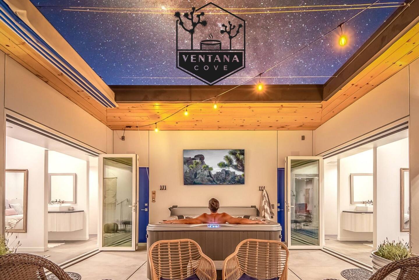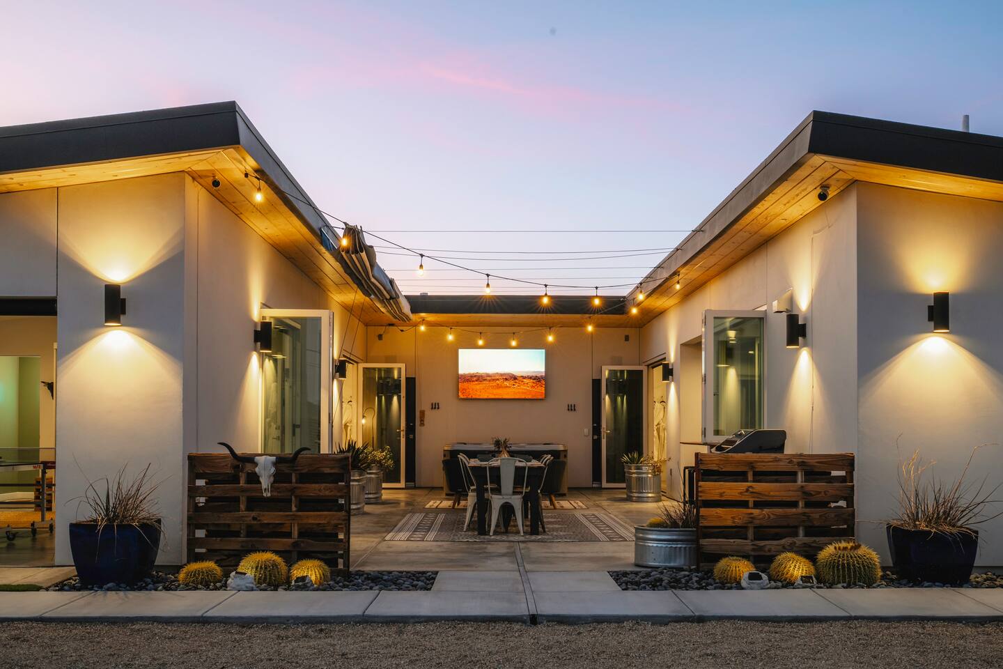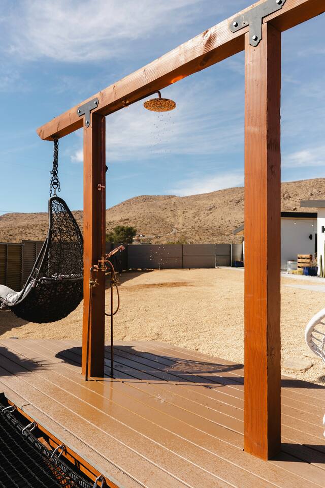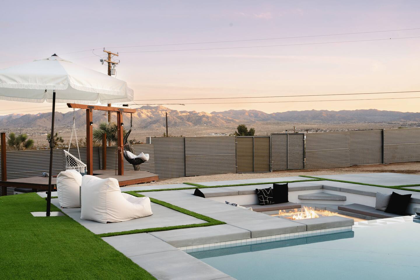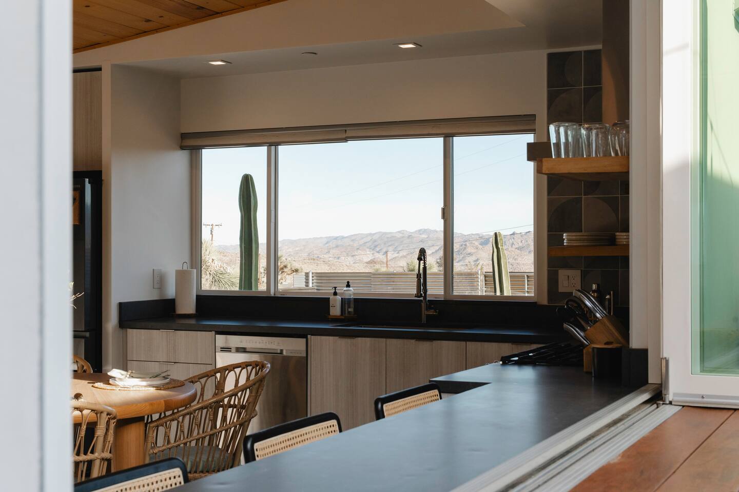 The Ventana Cove Pickleball Retreat by The Ventana Collection has been completely transformed and is back on the market March 2025. The Heated Saltwater Pool with custom waterfall into the sunken fire pit is a feature you won't find anywhere else. Relax on the pool loungers, bean bag chairs or included inflatable toys. The pooI can be heated all year round. Please contact for pool heating fees (varies by temp and season). The Pickleball Court and pro style Basketball Hoop offer a mountain view backdrop and fully fenced in play area so you can spend more time dinking and dunking than fetching. The living space features an open plan design with a plush low line sofa and a bright wingback chair that sit opposite the wall mounted 55" 4K TV with access to Netflix, Apple TV+ and Amazon Prime Video to keep everyone entertained. For additional guests, the couch has a full size sofa bed with 4" memory foam mattress. Slide open the bifold window to create an indoor-outdoor bar where you can serve up breakfast smoothies using the ninja blender or brew up a pot of coffee with your choice of a coffee maker or the French press using local aromatic Joshua Tree Coffee Company and tea. Create your next culinary masterpiece within the high-end gourmet kitchen that comes fully equipped with everything you could need and offers stunning views of the mountains while you cook. There is an oversize French door fridge with a filtered water and ice dispenser, a free-standing oven and stovetop, a microwave and a dishwasher to handle all the cleaning up. Dine inside at the modern dining table set for four, sit at the bar or eat alfresco style out on the patio with a rustic dining table under the retractable canopy to keep you out of the sun. There are three spacious bedrooms within the cove that are all separate from each other and feature huge “La Cantina” door walls that open out into the patio creating a seamless flow from one room to the other. Each of the bedrooms have their own private ensuite bathroom with luxurious rain fall showers and vanities stocked with all the essentials. The two master suites are filled with large memory foam king beds topped with hotel quality linen and bedding while the 3rd bedroom doubles as a studio where guests can roll out the ping pong table or open up the massive glass garage door to create the perfect space for a workout or to practice yoga. Or relive your youth on the Simpsons and Street Fighter arcade games. Then at night, drop down the comfortable memory foam queen size murphy bed for a restful night’s sleep. There are two desks. One is a fully enclosed office space for when you need complete isolation, the other is in the second bedroom. Very private and separated from the main living area. Wander over to the elevated stargazing deck and take an outdoor shower under the stars. Lounge in the stargazing net, then take a nap or read a book on of the relaxing hammocks under the shade of the Joshua trees. When night falls, light up the fire pit at the push of a button and enjoy the company of friends before retiring to the 6-person hot tub where you can Airplay your favorite songs through the multi-zone Sonos audio system. Watch a movie or put on the game with a huge new 85" TV above the hot tub or just lay back with a drink in hand and gaze up at the crystal clear night sky glittered with millions of stars. Electric Vehicle? There's a L2 40A charger in the carport for your convenience. We're pet friendly! The property is fenced in with special attention taken to remove all the *spikey things* that can get into paws.