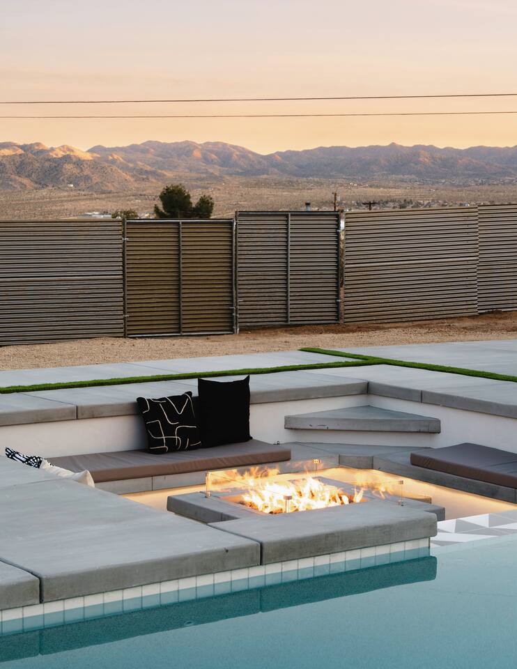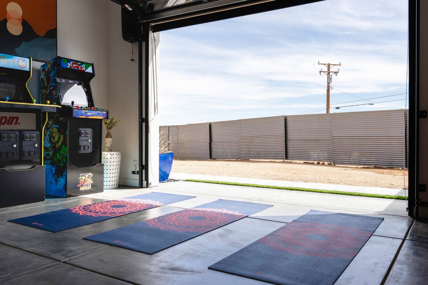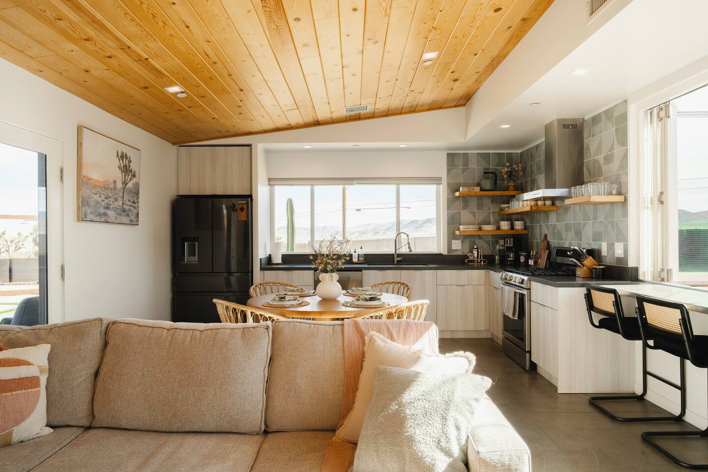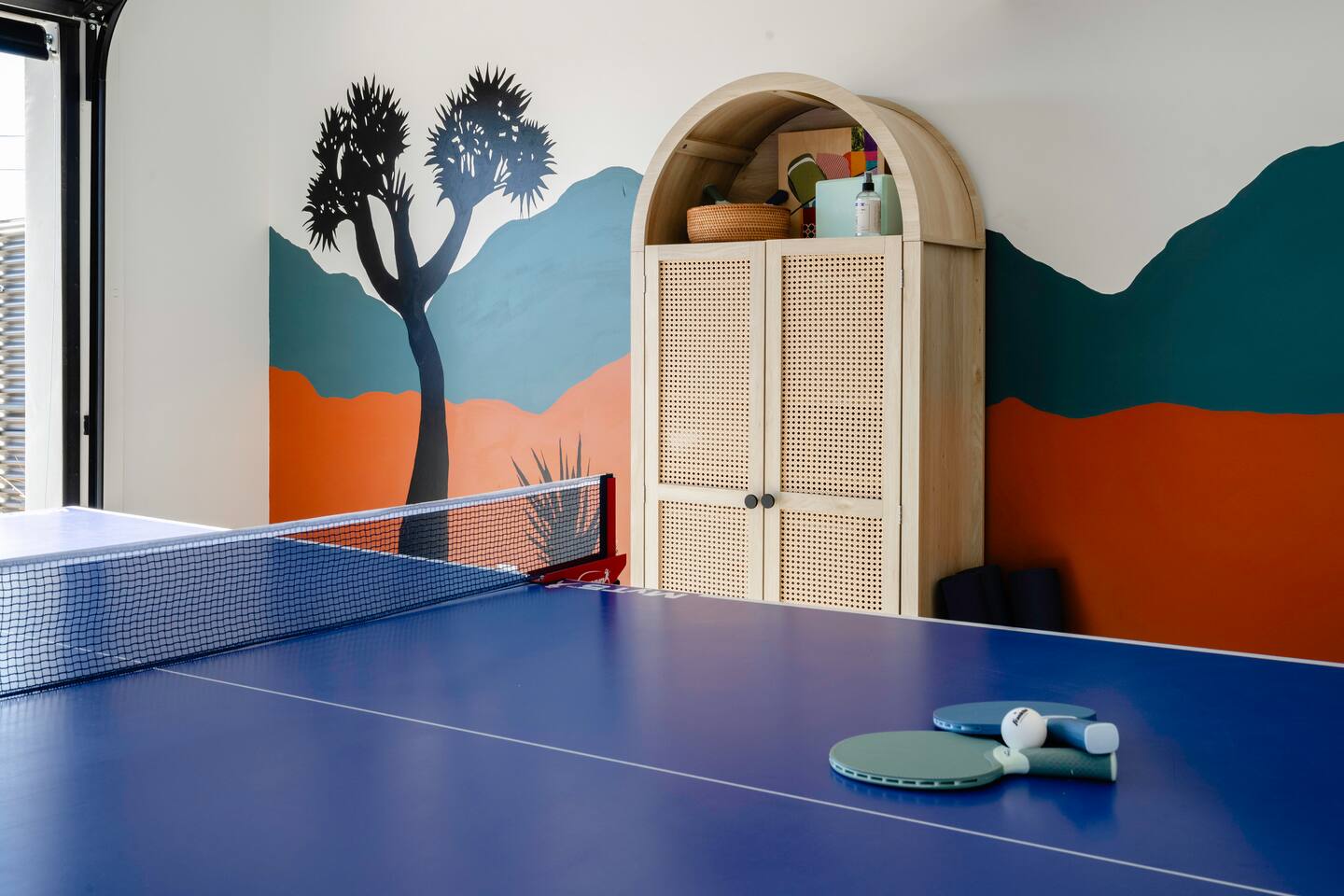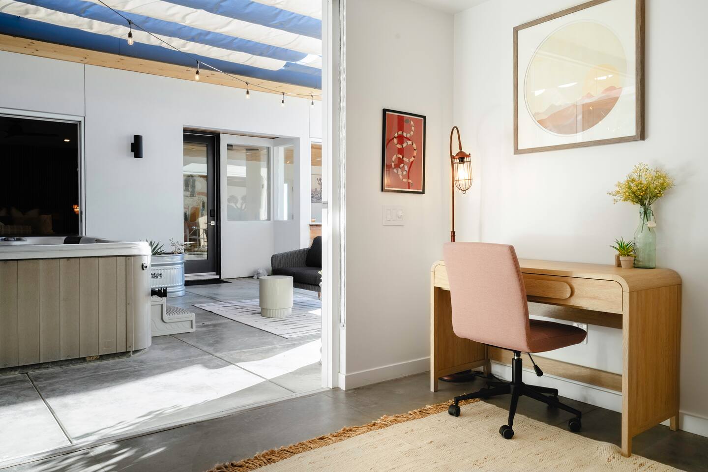 The Ventana Cove Pickleball Retreat by The Ventana Collection has been completely transformed and is back on the market March 2025. The Heated Saltwater Pool with custom waterfall into the sunken fire pit is a feature you won't find anywhere else. Relax on the pool loungers, bean bag chairs or included inflatable toys. The pooI can be heated all year round. Please contact for pool heating fees (varies by temp and season). The Pickleball Court and pro style Basketball Hoop offer a mountain view backdrop and fully fenced in play area so you can spend more time dinking and dunking than fetching. The living space features an open plan design with a plush low line sofa and a bright wingback chair that sit opposite the wall mounted 55" 4K TV with access to Netflix, Apple TV+ and Amazon Prime Video to keep everyone entertained. For additional guests, the couch has a full size sofa bed with 4" memory foam mattress. Slide open the bifold window to create an indoor-outdoor bar where you can serve up breakfast smoothies using the ninja blender or brew up a pot of coffee with your choice of a coffee maker or the French press using local aromatic Joshua Tree Coffee Company and tea. Create your next culinary masterpiece within the high-end gourmet kitchen that comes fully equipped with everything you could need and offers stunning views of the mountains while you cook. There is an oversize French door fridge with a filtered water and ice dispenser, a free-standing oven and stovetop, a microwave and a dishwasher to handle all the cleaning up. Dine inside at the modern dining table set for four, sit at the bar or eat alfresco style out on the patio with a rustic dining table under the retractable canopy to keep you out of the sun. There are three spacious bedrooms within the cove that are all separate from each other and feature huge “La Cantina” door walls that open out into the patio creating a seamless flow from one room to the other. Each of the bedrooms have their own private ensuite bathroom with luxurious rain fall showers and vanities stocked with all the essentials. The two master suites are filled with large memory foam king beds topped with hotel quality linen and bedding while the 3rd bedroom doubles as a studio where guests can roll out the ping pong table or open up the massive glass garage door to create the perfect space for a workout or to practice yoga. Or relive your youth on the Simpsons and Street Fighter arcade games. Then at night, drop down the comfortable memory foam queen size murphy bed for a restful night’s sleep. There are two desks. One is a fully enclosed office space for when you need complete isolation, the other is in the second bedroom. Very private and separated from the main living area. Wander over to the elevated stargazing deck and take an outdoor shower under the stars. Lounge in the stargazing net, then take a nap or read a book on of the relaxing hammocks under the shade of the Joshua trees. When night falls, light up the fire pit at the push of a button and enjoy the company of friends before retiring to the 6-person hot tub where you can Airplay your favorite songs through the multi-zone Sonos audio system. Watch a movie or put on the game with a huge new 85" TV above the hot tub or just lay back with a drink in hand and gaze up at the crystal clear night sky glittered with millions of stars. Electric Vehicle? There's a L2 40A charger in the carport for your convenience. We're pet friendly! The property is fenced in with special attention taken to remove all the *spikey things* that can get into paws.