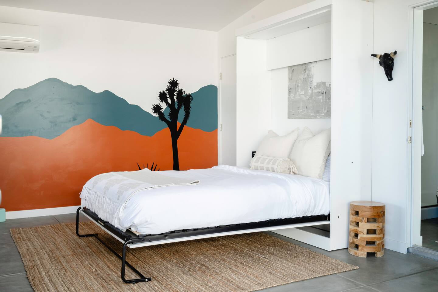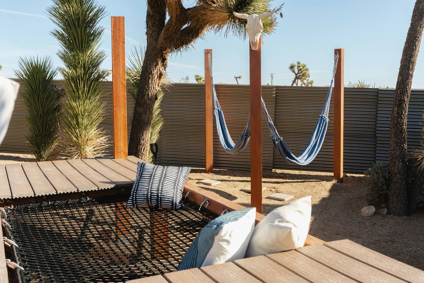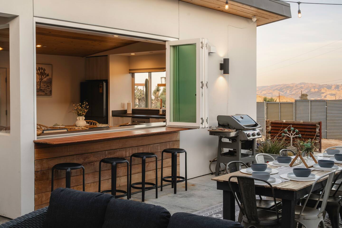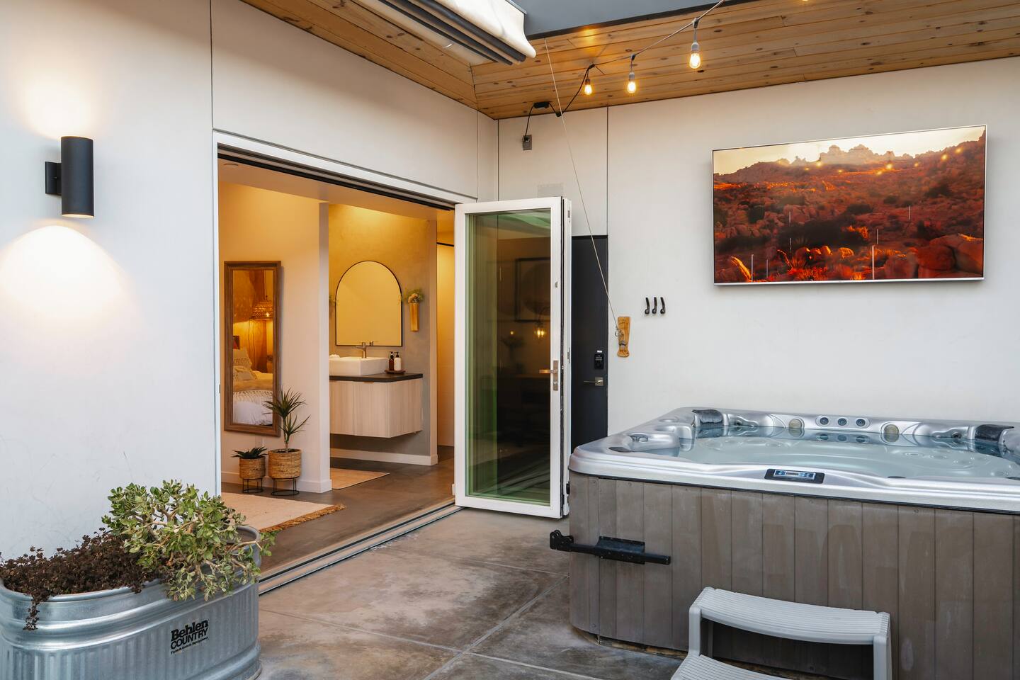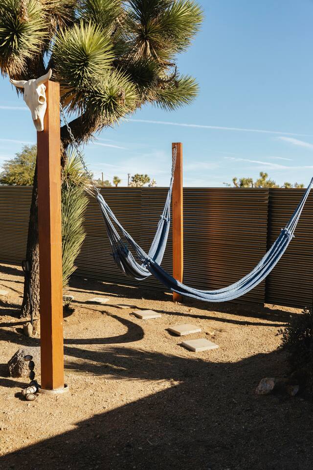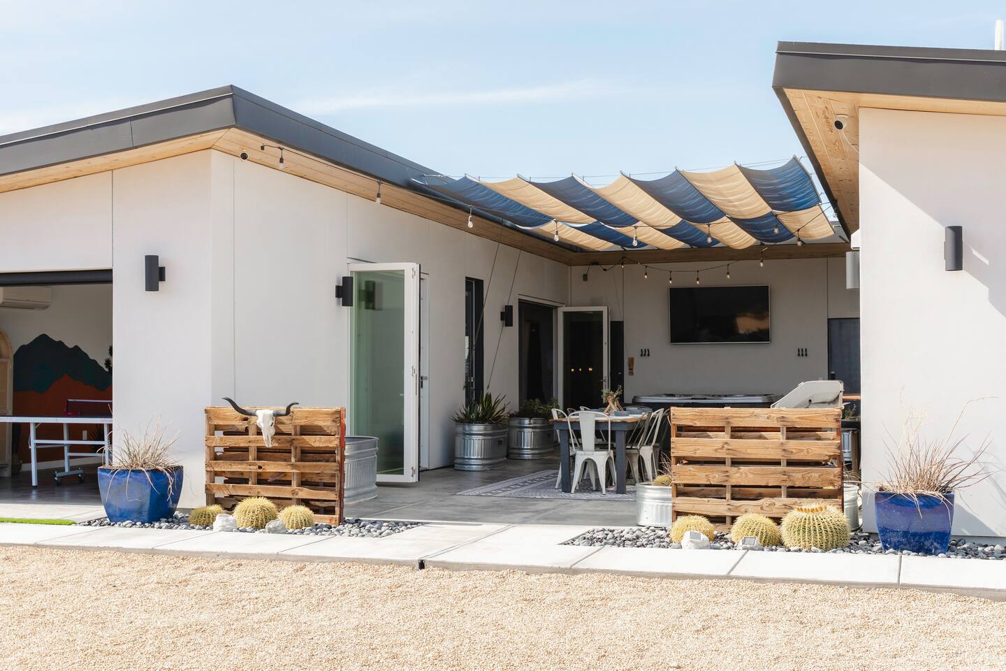 The Ventana Cove Pickleball Retreat by The Ventana Collection has been completely transformed and is back on the market March 2025. The Heated Saltwater Pool with custom waterfall into the sunken fire pit is a feature you won't find anywhere else. Relax on the pool loungers, bean bag chairs or included inflatable toys. The pooI can be heated all year round. Please contact for pool heating fees (varies by temp and season). The Pickleball Court and pro style Basketball Hoop offer a mountain view backdrop and fully fenced in play area so you can spend more time dinking and dunking than fetching. The living space features an open plan design with a plush low line sofa and a bright wingback chair that sit opposite the wall mounted 55" 4K TV with access to Netflix, Apple TV+ and Amazon Prime Video to keep everyone entertained. For additional guests, the couch has a full size sofa bed with 4" memory foam mattress. Slide open the bifold window to create an indoor-outdoor bar where you can serve up breakfast smoothies using the ninja blender or brew up a pot of coffee with your choice of a coffee maker or the French press using local aromatic Joshua Tree Coffee Company and tea. Create your next culinary masterpiece within the high-end gourmet kitchen that comes fully equipped with everything you could need and offers stunning views of the mountains while you cook. There is an oversize French door fridge with a filtered water and ice dispenser, a free-standing oven and stovetop, a microwave and a dishwasher to handle all the cleaning up. Dine inside at the modern dining table set for four, sit at the bar or eat alfresco style out on the patio with a rustic dining table under the retractable canopy to keep you out of the sun. There are three spacious bedrooms within the cove that are all separate from each other and feature huge “La Cantina” door walls that open out into the patio creating a seamless flow from one room to the other. Each of the bedrooms have their own private ensuite bathroom with luxurious rain fall showers and vanities stocked with all the essentials. The two master suites are filled with large memory foam king beds topped with hotel quality linen and bedding while the 3rd bedroom doubles as a studio where guests can roll out the ping pong table or open up the massive glass garage door to create the perfect space for a workout or to practice yoga. Or relive your youth on the Simpsons and Street Fighter arcade games. Then at night, drop down the comfortable memory foam queen size murphy bed for a restful night’s sleep. There are two desks. One is a fully enclosed office space for when you need complete isolation, the other is in the second bedroom. Very private and separated from the main living area. Wander over to the elevated stargazing deck and take an outdoor shower under the stars. Lounge in the stargazing net, then take a nap or read a book on of the relaxing hammocks under the shade of the Joshua trees. When night falls, light up the fire pit at the push of a button and enjoy the company of friends before retiring to the 6-person hot tub where you can Airplay your favorite songs through the multi-zone Sonos audio system. Watch a movie or put on the game with a huge new 85" TV above the hot tub or just lay back with a drink in hand and gaze up at the crystal clear night sky glittered with millions of stars. Electric Vehicle? There's a L2 40A charger in the carport for your convenience. We're pet friendly! The property is fenced in with special attention taken to remove all the *spikey things* that can get into paws.
