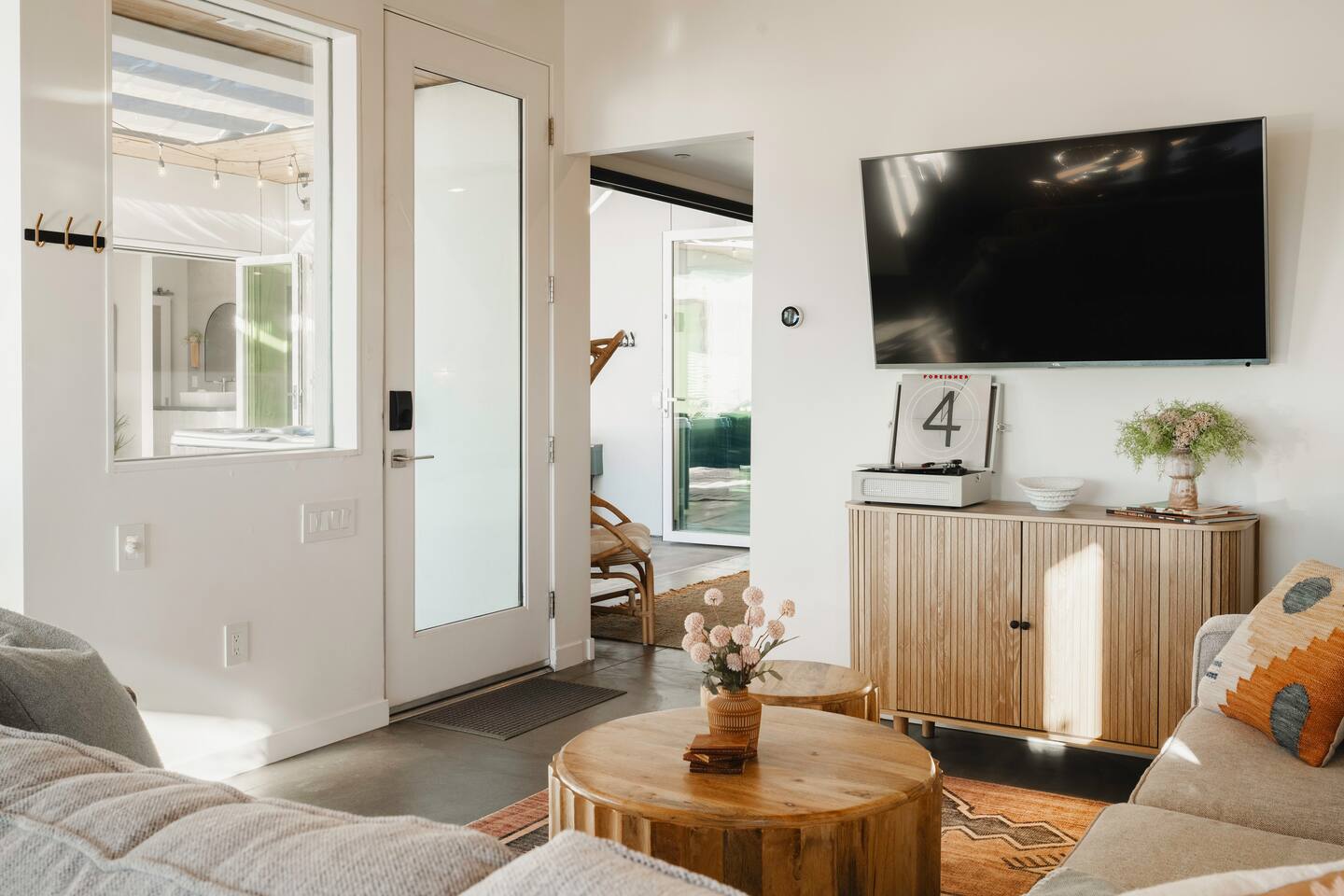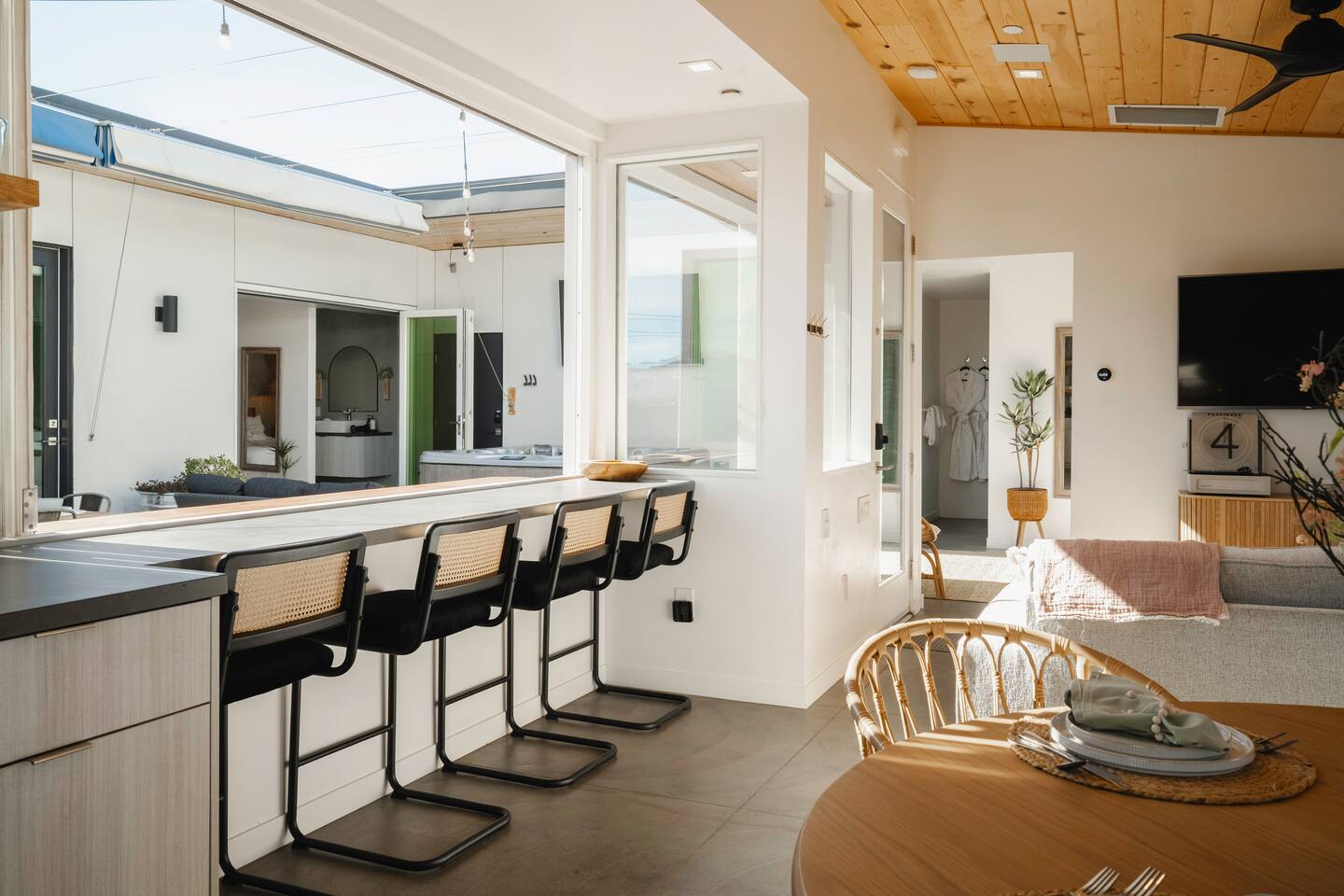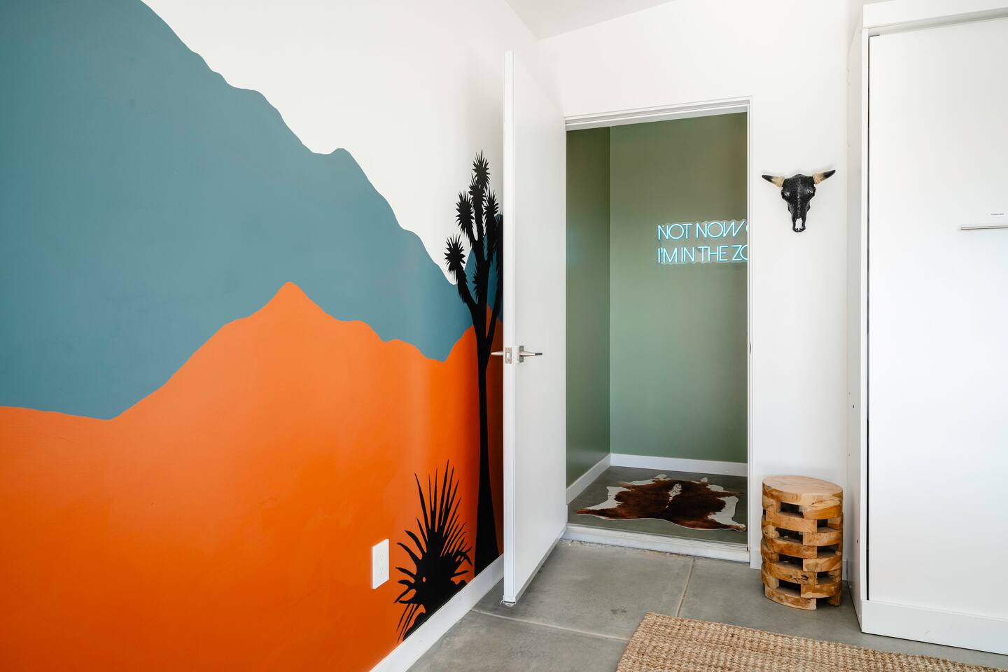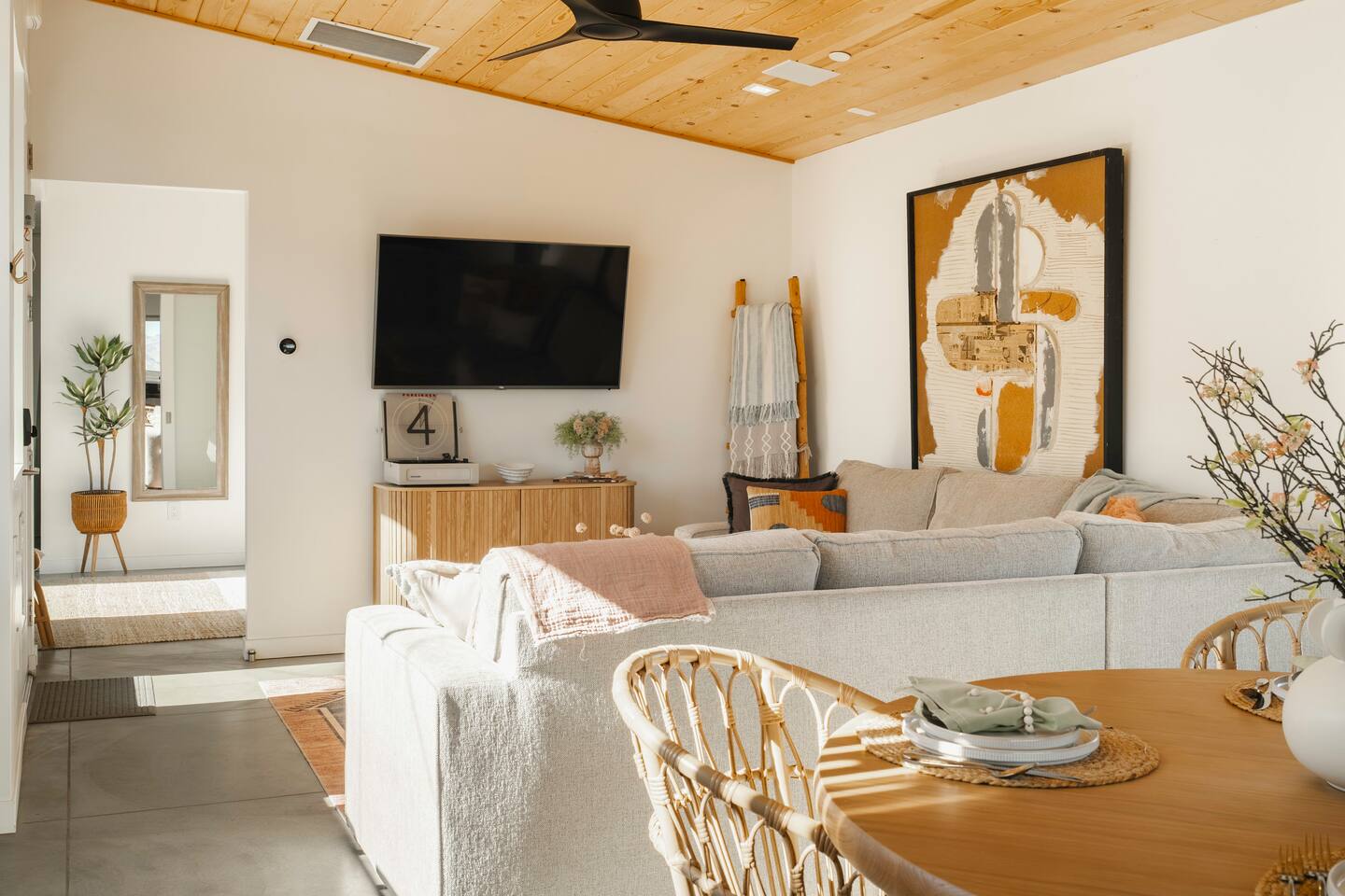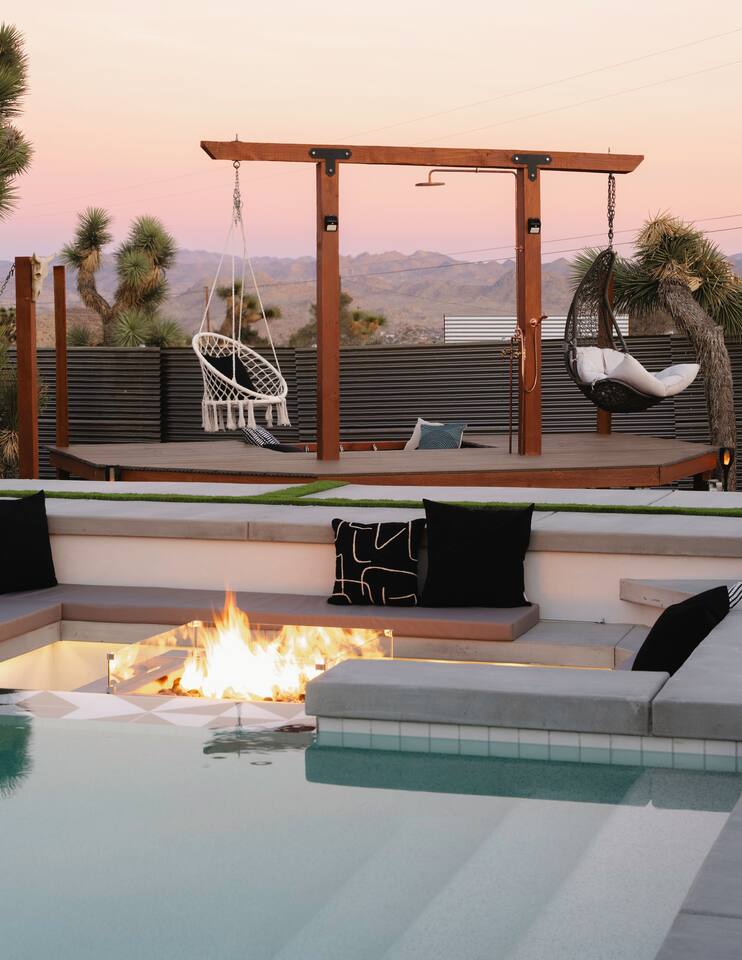 The Ventana Cove Pickleball Retreat by The Ventana Collection has been completely transformed and is back on the market March 2025. The Heated Saltwater Pool with custom waterfall into the sunken fire pit is a feature you won't find anywhere else. Relax on the pool loungers, bean bag chairs or included inflatable toys. The pooI can be heated all year round. Please contact for pool heating fees (varies by temp and season). The Pickleball Court and pro style Basketball Hoop offer a mountain view backdrop and fully fenced in play area so you can spend more time dinking and dunking than fetching. The living space features an open plan design with a plush low line sofa and a bright wingback chair that sit opposite the wall mounted 55" 4K TV with access to Netflix, Apple TV+ and Amazon Prime Video to keep everyone entertained. For additional guests, the couch has a full size sofa bed with 4" memory foam mattress. Slide open the bifold window to create an indoor-outdoor bar where you can serve up breakfast smoothies using the ninja blender or brew up a pot of coffee with your choice of a coffee maker or the French press using local aromatic Joshua Tree Coffee Company and tea. Create your next culinary masterpiece within the high-end gourmet kitchen that comes fully equipped with everything you could need and offers stunning views of the mountains while you cook. There is an oversize French door fridge with a filtered water and ice dispenser, a free-standing oven and stovetop, a microwave and a dishwasher to handle all the cleaning up. Dine inside at the modern dining table set for four, sit at the bar or eat alfresco style out on the patio with a rustic dining table under the retractable canopy to keep you out of the sun. There are three spacious bedrooms within the cove that are all separate from each other and feature huge “La Cantina” door walls that open out into the patio creating a seamless flow from one room to the other. Each of the bedrooms have their own private ensuite bathroom with luxurious rain fall showers and vanities stocked with all the essentials. The two master suites are filled with large memory foam king beds topped with hotel quality linen and bedding while the 3rd bedroom doubles as a studio where guests can roll out the ping pong table or open up the massive glass garage door to create the perfect space for a workout or to practice yoga. Or relive your youth on the Simpsons and Street Fighter arcade games. Then at night, drop down the comfortable memory foam queen size murphy bed for a restful night’s sleep. There are two desks. One is a fully enclosed office space for when you need complete isolation, the other is in the second bedroom. Very private and separated from the main living area. Wander over to the elevated stargazing deck and take an outdoor shower under the stars. Lounge in the stargazing net, then take a nap or read a book on of the relaxing hammocks under the shade of the Joshua trees. When night falls, light up the fire pit at the push of a button and enjoy the company of friends before retiring to the 6-person hot tub where you can Airplay your favorite songs through the multi-zone Sonos audio system. Watch a movie or put on the game with a huge new 85" TV above the hot tub or just lay back with a drink in hand and gaze up at the crystal clear night sky glittered with millions of stars. Electric Vehicle? There's a L2 40A charger in the carport for your convenience. We're pet friendly! The property is fenced in with special attention taken to remove all the *spikey things* that can get into paws.