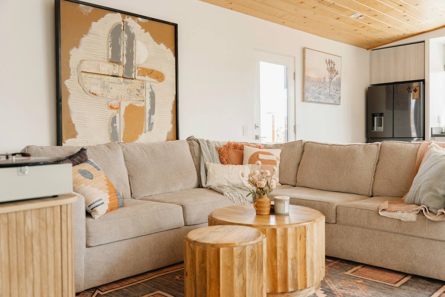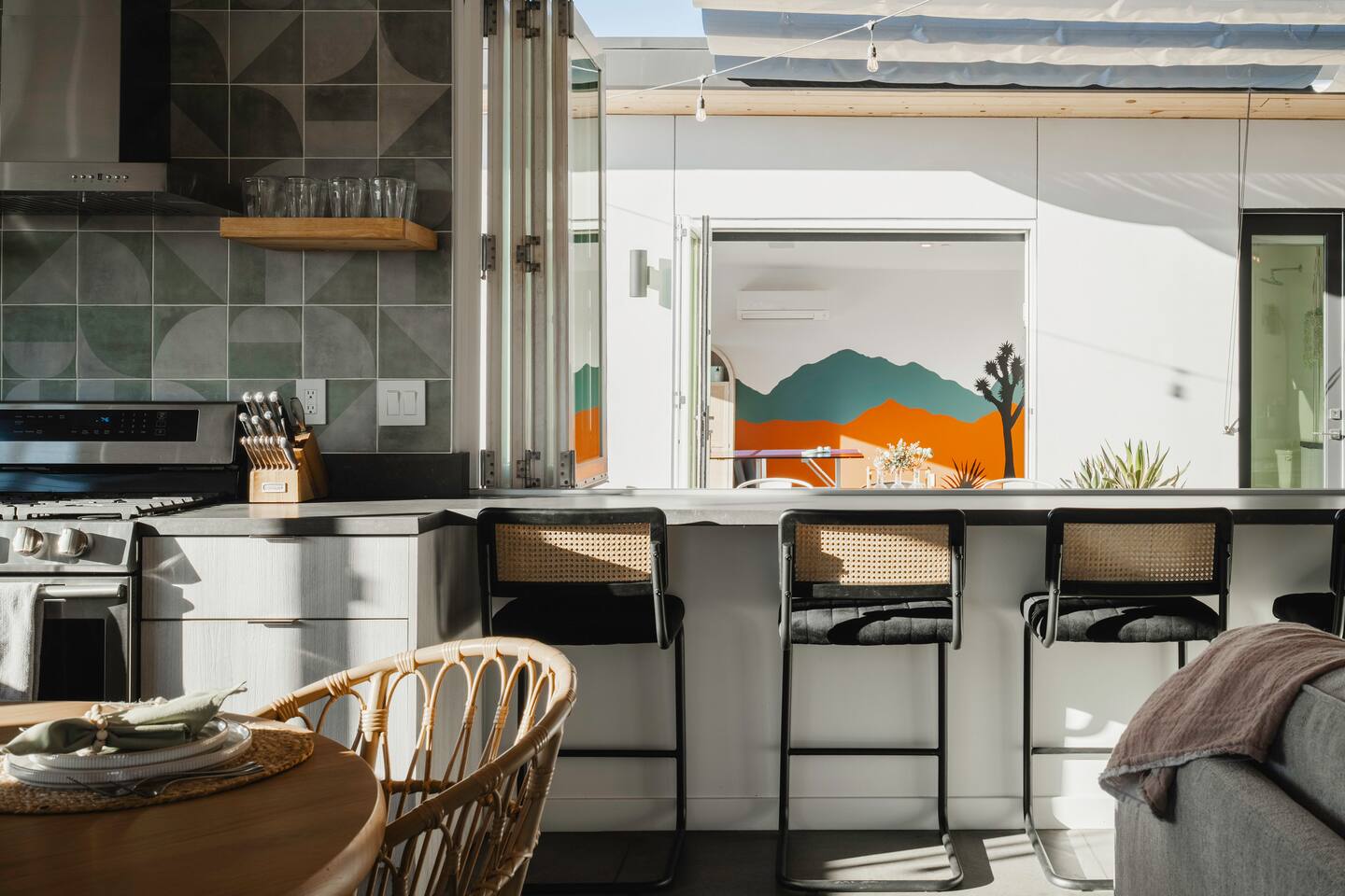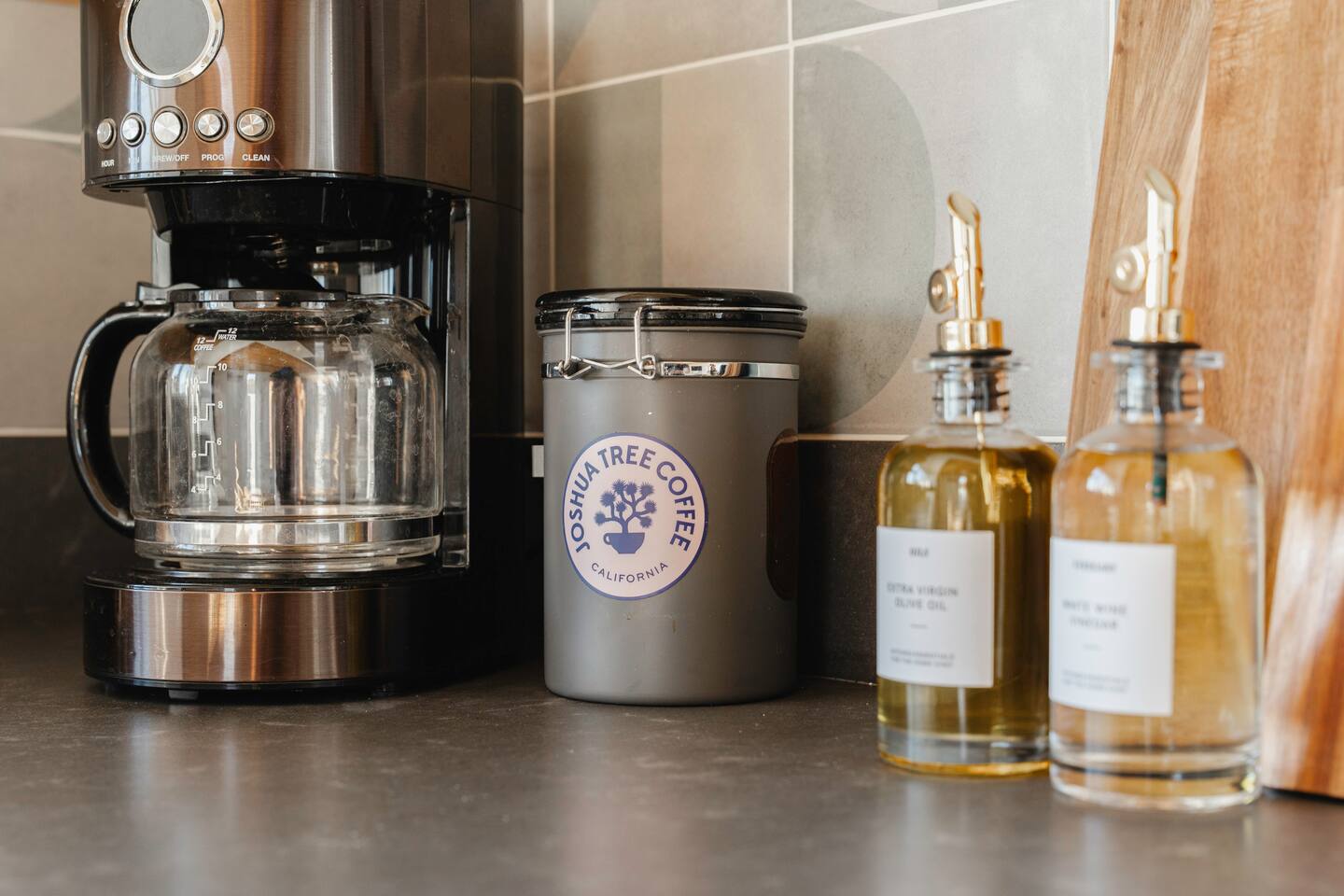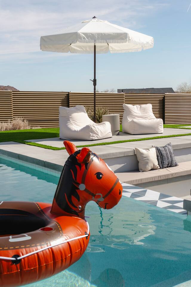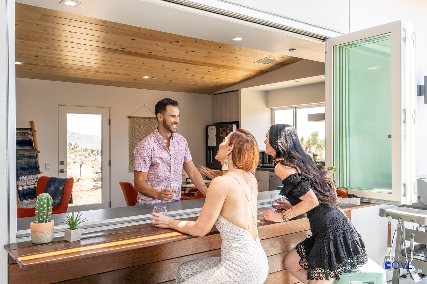 The Ventana Cove Pickleball Retreat by The Ventana Collection has been completely transformed and is back on the market March 2025. The Heated Saltwater Pool with custom waterfall into the sunken fire pit is a feature you won't find anywhere else. Relax on the pool loungers, bean bag chairs or included inflatable toys. The pooI can be heated all year round. Please contact for pool heating fees (varies by temp and season). The Pickleball Court and pro style Basketball Hoop offer a mountain view backdrop and fully fenced in play area so you can spend more time dinking and dunking than fetching. The living space features an open plan design with a plush low line sofa and a bright wingback chair that sit opposite the wall mounted 55" 4K TV with access to Netflix, Apple TV+ and Amazon Prime Video to keep everyone entertained. For additional guests, the couch has a full size sofa bed with 4" memory foam mattress. Slide open the bifold window to create an indoor-outdoor bar where you can serve up breakfast smoothies using the ninja blender or brew up a pot of coffee with your choice of a coffee maker or the French press using local aromatic Joshua Tree Coffee Company and tea. Create your next culinary masterpiece within the high-end gourmet kitchen that comes fully equipped with everything you could need and offers stunning views of the mountains while you cook. There is an oversize French door fridge with a filtered water and ice dispenser, a free-standing oven and stovetop, a microwave and a dishwasher to handle all the cleaning up. Dine inside at the modern dining table set for four, sit at the bar or eat alfresco style out on the patio with a rustic dining table under the retractable canopy to keep you out of the sun. There are three spacious bedrooms within the cove that are all separate from each other and feature huge “La Cantina” door walls that open out into the patio creating a seamless flow from one room to the other. Each of the bedrooms have their own private ensuite bathroom with luxurious rain fall showers and vanities stocked with all the essentials. The two master suites are filled with large memory foam king beds topped with hotel quality linen and bedding while the 3rd bedroom doubles as a studio where guests can roll out the ping pong table or open up the massive glass garage door to create the perfect space for a workout or to practice yoga. Or relive your youth on the Simpsons and Street Fighter arcade games. Then at night, drop down the comfortable memory foam queen size murphy bed for a restful night’s sleep. There are two desks. One is a fully enclosed office space for when you need complete isolation, the other is in the second bedroom. Very private and separated from the main living area. Wander over to the elevated stargazing deck and take an outdoor shower under the stars. Lounge in the stargazing net, then take a nap or read a book on of the relaxing hammocks under the shade of the Joshua trees. When night falls, light up the fire pit at the push of a button and enjoy the company of friends before retiring to the 6-person hot tub where you can Airplay your favorite songs through the multi-zone Sonos audio system. Watch a movie or put on the game with a huge new 85" TV above the hot tub or just lay back with a drink in hand and gaze up at the crystal clear night sky glittered with millions of stars. Electric Vehicle? There's a L2 40A charger in the carport for your convenience. We're pet friendly! The property is fenced in with special attention taken to remove all the *spikey things* that can get into paws.