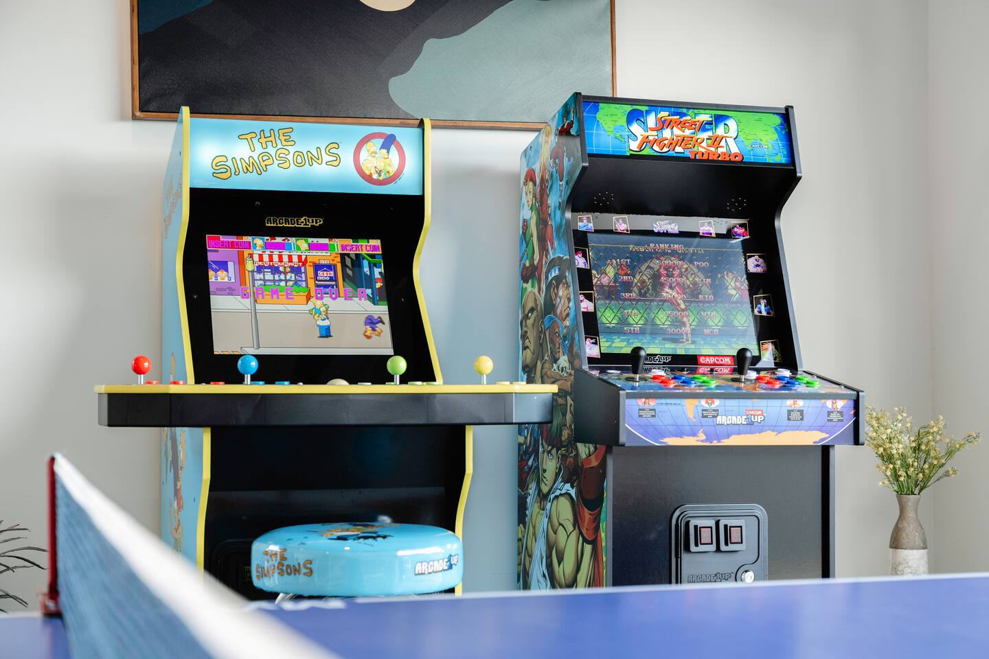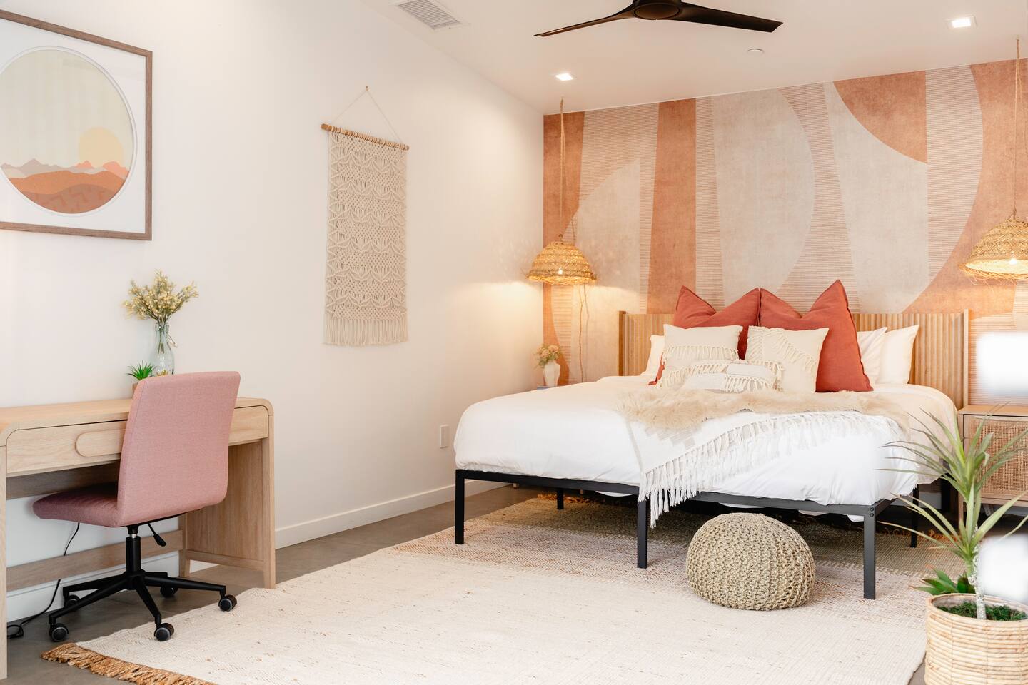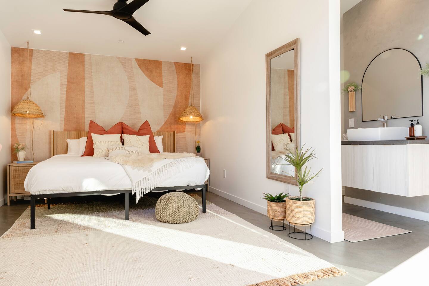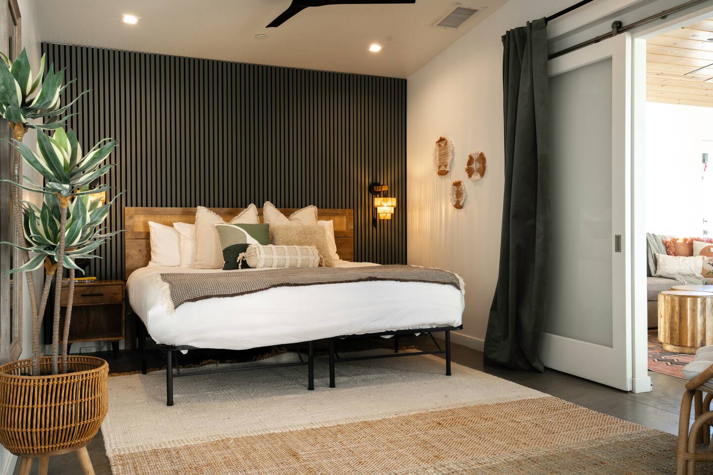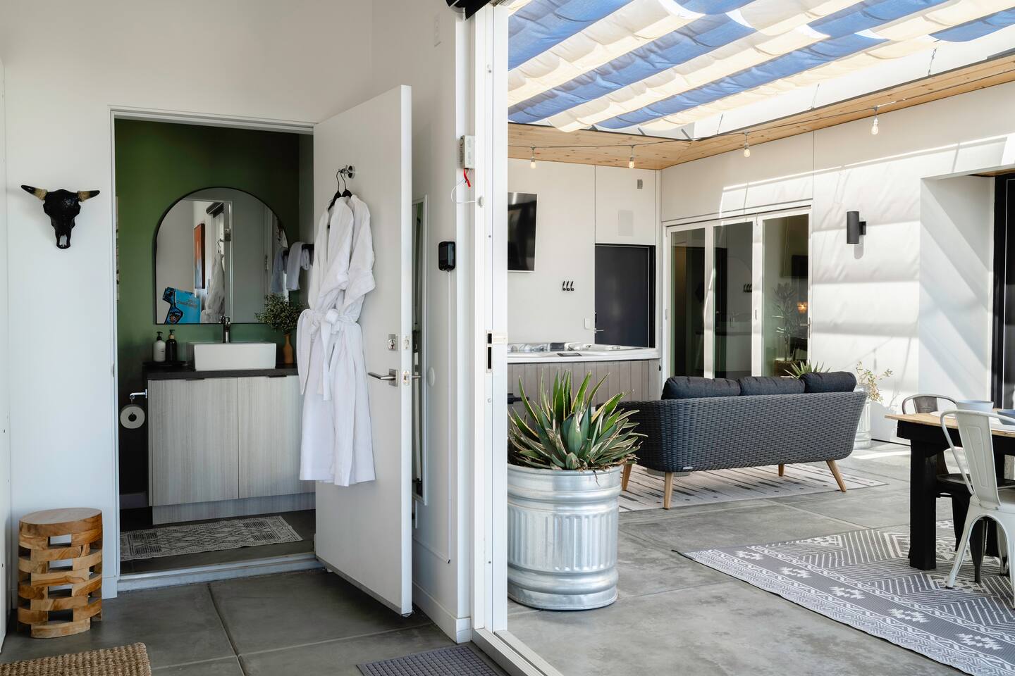 The Ventana Cove Pickleball Retreat by The Ventana Collection has been completely transformed and is back on the market March 2025. The Heated Saltwater Pool with custom waterfall into the sunken fire pit is a feature you won't find anywhere else. Relax on the pool loungers, bean bag chairs or included inflatable toys. The pooI can be heated all year round. Please contact for pool heating fees (varies by temp and season). The Pickleball Court and pro style Basketball Hoop offer a mountain view backdrop and fully fenced in play area so you can spend more time dinking and dunking than fetching. The living space features an open plan design with a plush low line sofa and a bright wingback chair that sit opposite the wall mounted 55" 4K TV with access to Netflix, Apple TV+ and Amazon Prime Video to keep everyone entertained. For additional guests, the couch has a full size sofa bed with 4" memory foam mattress. Slide open the bifold window to create an indoor-outdoor bar where you can serve up breakfast smoothies using the ninja blender or brew up a pot of coffee with your choice of a coffee maker or the French press using local aromatic Joshua Tree Coffee Company and tea. Create your next culinary masterpiece within the high-end gourmet kitchen that comes fully equipped with everything you could need and offers stunning views of the mountains while you cook. There is an oversize French door fridge with a filtered water and ice dispenser, a free-standing oven and stovetop, a microwave and a dishwasher to handle all the cleaning up. Dine inside at the modern dining table set for four, sit at the bar or eat alfresco style out on the patio with a rustic dining table under the retractable canopy to keep you out of the sun. There are three spacious bedrooms within the cove that are all separate from each other and feature huge “La Cantina” door walls that open out into the patio creating a seamless flow from one room to the other. Each of the bedrooms have their own private ensuite bathroom with luxurious rain fall showers and vanities stocked with all the essentials. The two master suites are filled with large memory foam king beds topped with hotel quality linen and bedding while the 3rd bedroom doubles as a studio where guests can roll out the ping pong table or open up the massive glass garage door to create the perfect space for a workout or to practice yoga. Or relive your youth on the Simpsons and Street Fighter arcade games. Then at night, drop down the comfortable memory foam queen size murphy bed for a restful night’s sleep. There are two desks. One is a fully enclosed office space for when you need complete isolation, the other is in the second bedroom. Very private and separated from the main living area. Wander over to the elevated stargazing deck and take an outdoor shower under the stars. Lounge in the stargazing net, then take a nap or read a book on of the relaxing hammocks under the shade of the Joshua trees. When night falls, light up the fire pit at the push of a button and enjoy the company of friends before retiring to the 6-person hot tub where you can Airplay your favorite songs through the multi-zone Sonos audio system. Watch a movie or put on the game with a huge new 85" TV above the hot tub or just lay back with a drink in hand and gaze up at the crystal clear night sky glittered with millions of stars. Electric Vehicle? There's a L2 40A charger in the carport for your convenience. We're pet friendly! The property is fenced in with special attention taken to remove all the *spikey things* that can get into paws.