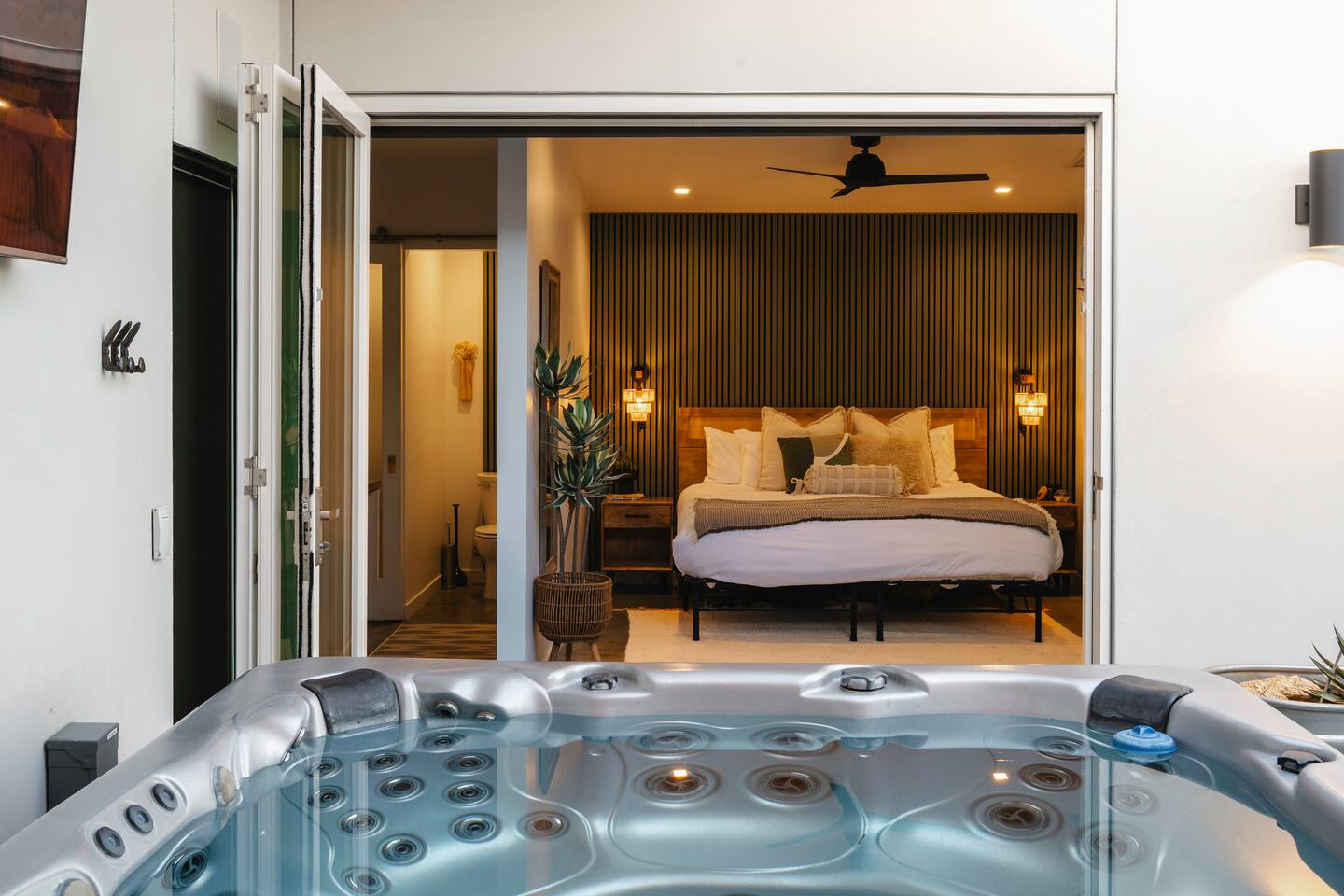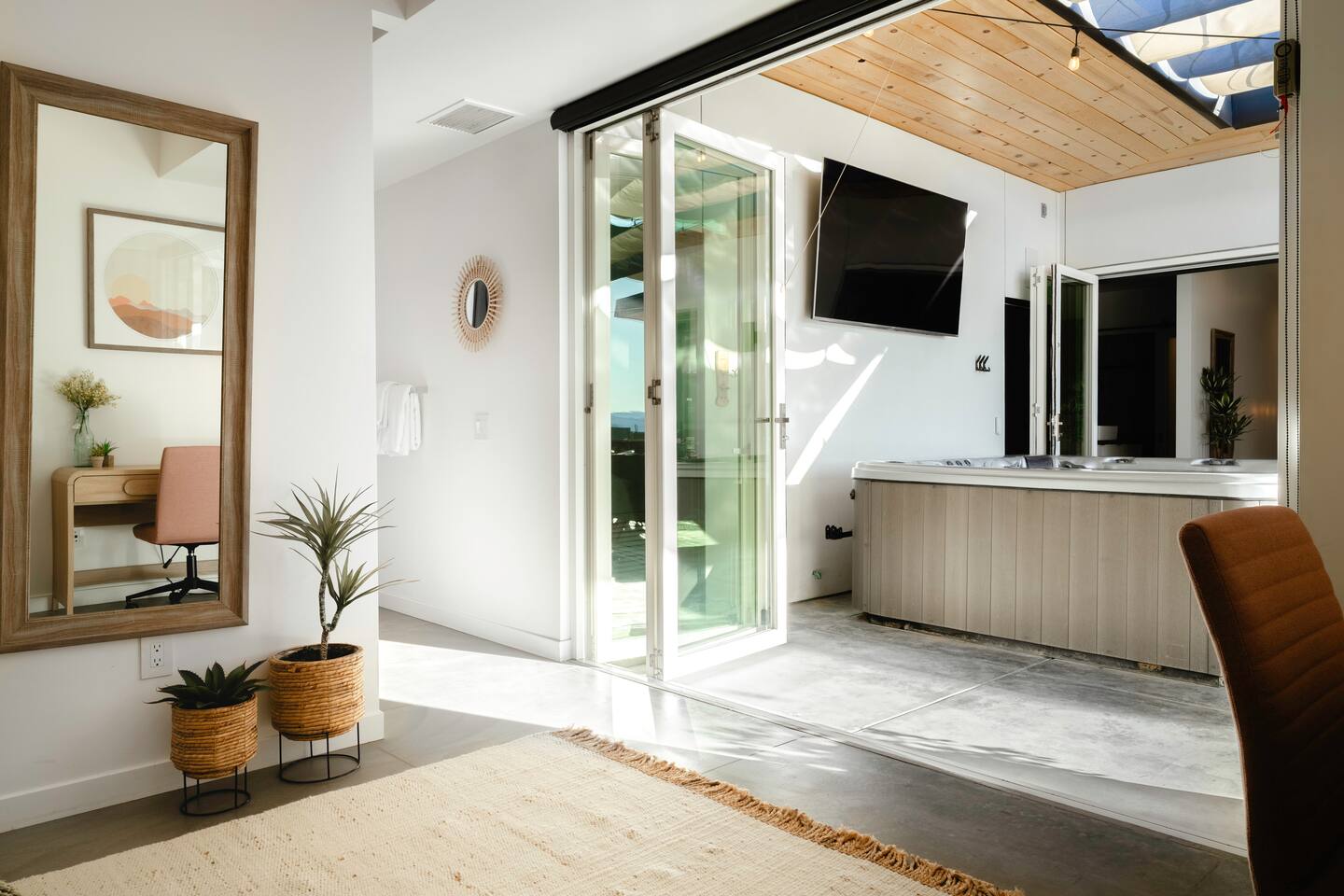@ventanacollection Welcome to the Ventana Cove Pickleball and Pool Retreat The highlights: - Heated Saltwater Pool (heating fee varies by date) - Pickleball Court with basketball hoop - Sunken Fire pit with pool water fall feature - Central Hot Tub in the Patio with 85" TV and Sonos Sound - Outdoor Shower on the stargazing deck - 3 bedrooms with ensuite bathrooms - Custom architecture with bifold sliding walls and indoor/outdoor bar